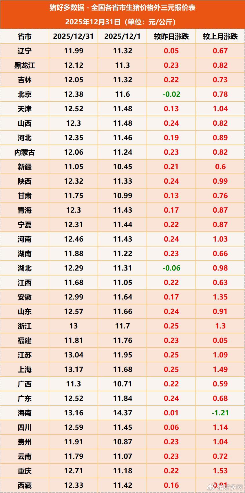 具体我们来看一下。数据显示,11月份全国生猪出场价格为12.33元/公斤,环比上涨0.5%。虽然12月初猪价有所回落,但截至到12月第4周,生猪价格已成功实现2周连续反弹,全国生猪平均价格来到12.19元/公斤,比前一周上涨0.2%,且周内全国20个省生猪价格上涨。由此我们预计,12月份生猪出场价格大概率维持节节攀升态势。