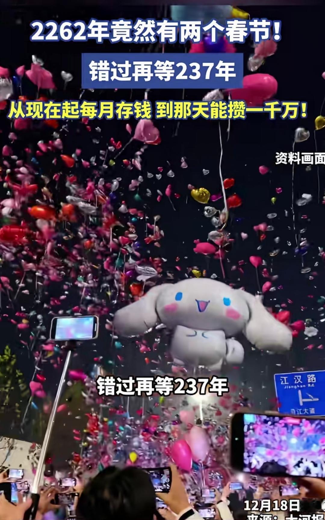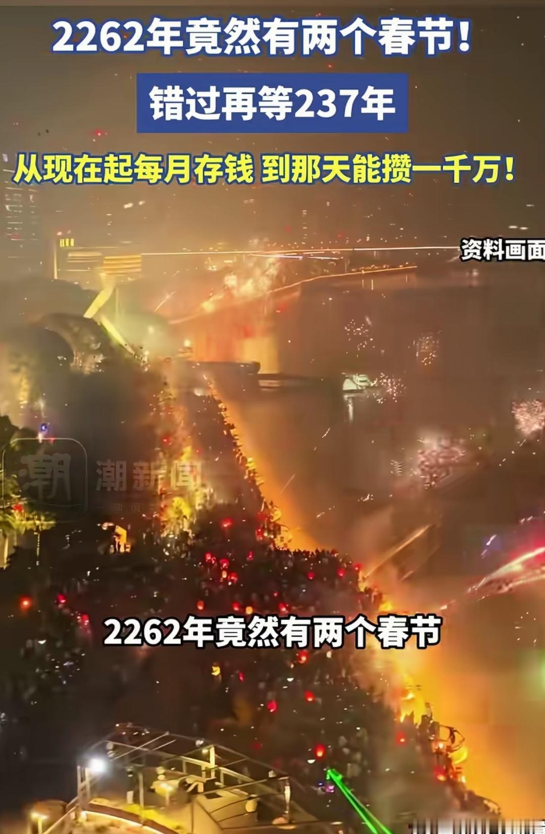 临近春节了! 在外的流子,盼着这天回家与亲人好友团聚。 守留老人、妻儿,盼着在外的漂泊的儿女、丈夫、父亲回家团圆。 一年只有一个春节,为什么没有两个春节呢? 再坚持一下,到2262年,就有两个春节了! 错过了,就要再等2262-2026=236年! 今生是注定要错过了,没事,等再生,算好那个时间段投胎,定不会错过!