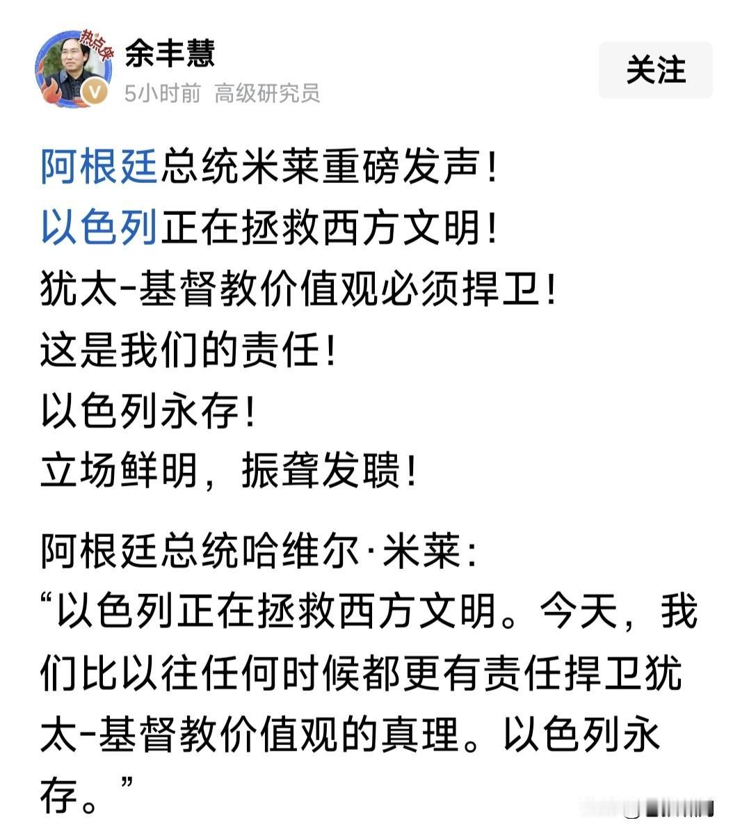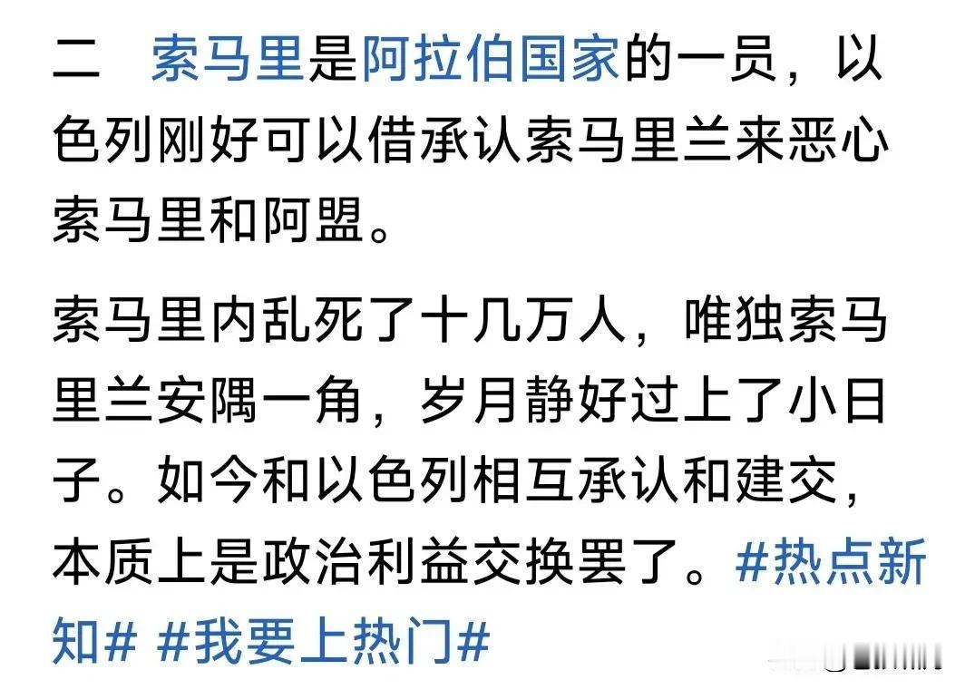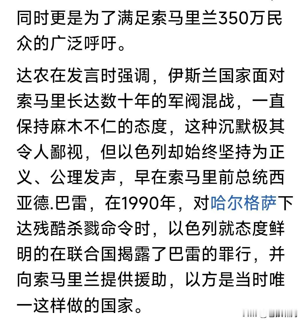 以色列硬扛联合国!驻联大使驳斥伊斯兰国家指责,不撤销与索马里兰建交,因为此举符合以色列利益,也符合国际准则,更符合索马里兰人民愿望。 达农质问某些国家:当年索马里几十年内战,巴雷屠杀十几万人民,你们做了什么?只有以色列伸出援助之手,使索马里兰免于灾难,稳定发展至今。 还有一点很重要:某些国家谴责以色列承认索马里兰,是分裂主权国家?那请问:哈马斯真主党胡塞是否分裂势力?他们分裂巴勒斯坦黎巴嫩也门,你们为什么支持这些反政府分裂势力呢? 苍狼刚好看到米莱一番言论,感觉十分震撼:以色列正在拯救西方文明!犹太和基督教价值观必须捍卫!这是我们的责任,也是世界正义国家的责任! 且不说米莱所言正确与否!只说阿根廷地处南美,与以色列八竿子打不着,米莱为何如此支持以色列呢?只能说明米莱价值观,和内塔尼亚胡很相近? 忽然想记起网友一段话:世界21世纪,有几个人会载入史册:泽连斯基守住了国门!内塔尼亚胡守住了文明!川普和查理守住了属灵的征战立国精神! 本人觉得这段话,前两句话说得有点道理,但后面一句值得商榷。而且应该加上米莱,他将改变阿根廷的历史! 苍狼说得对不对?欢迎网友批评! …………