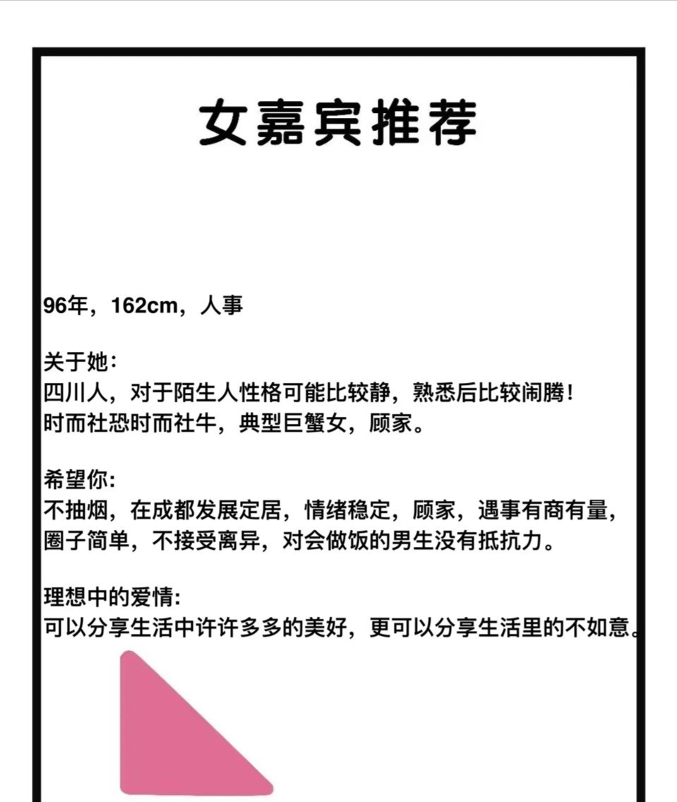 成都征婚【第7525号】96年四川女生,身高162,人事工作;安静又闹腾,社恐又社牛。希望男生情绪稳定,定居成都,未婚不抽烟,最好会做饭,真诚奔结婚… 详情戳图↓特约嘉宾——有意者请私信小美,投稿/加群/周末相亲会/小红娘1V1牵线 请私信! 成都征婚成都相亲