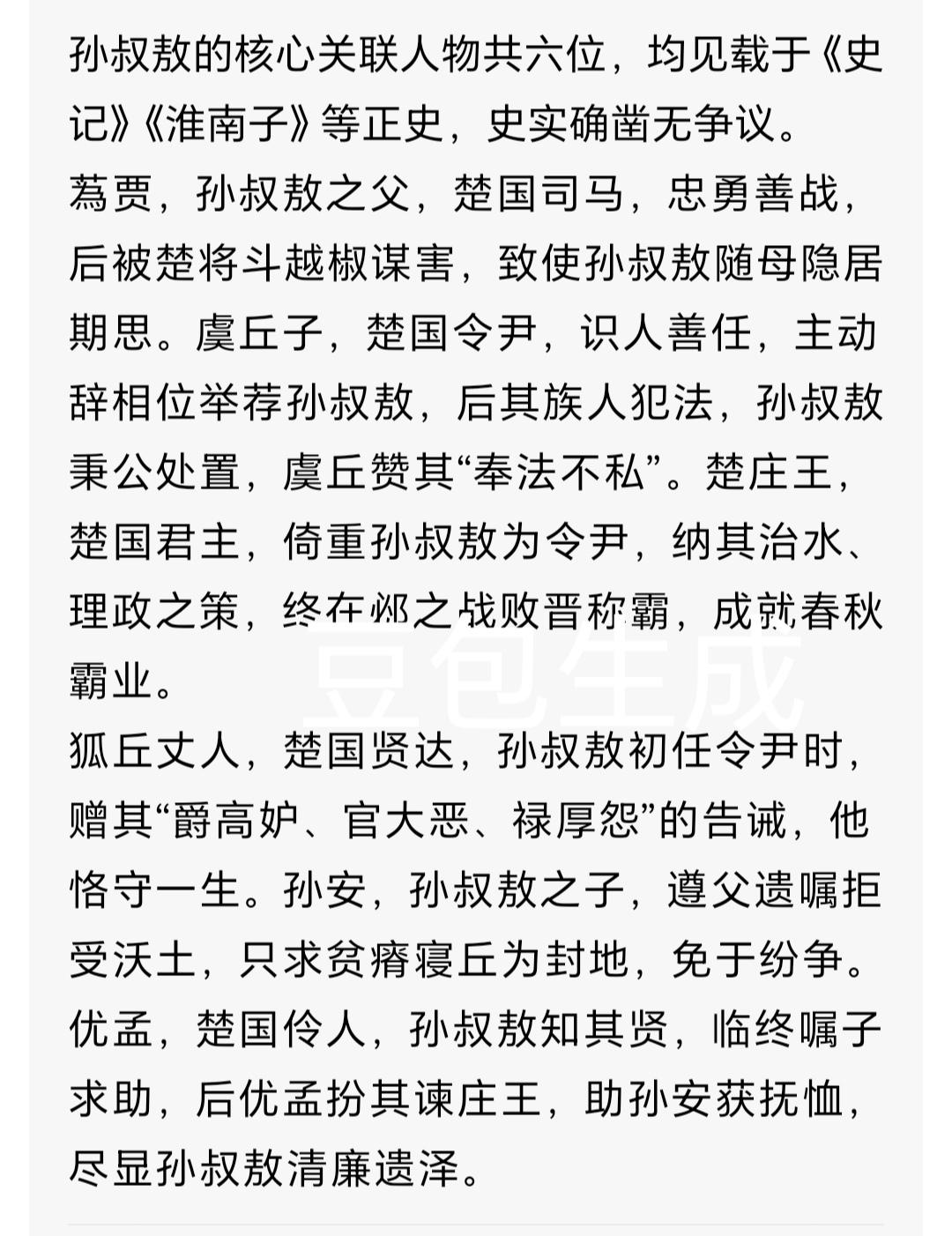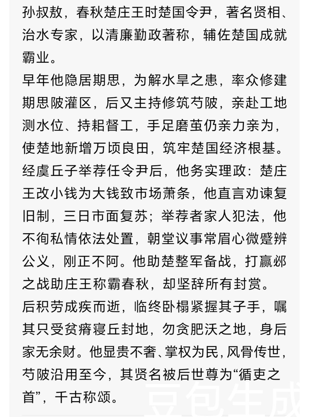 楚庄王贤臣孙叔敖,三任令尹家无余财,临终遗言藏着千年智慧 周朝时期楚庄王之臣(孙叔敖)的一生 都说高官厚禄能荫庇子孙,春秋楚国令尹孙叔敖却截然相反。他辅佐楚庄王称霸诸侯,稳居楚国朝堂核心,位极人臣三十年,死后儿子竟要靠上山砍柴糊口;可他临终一句嘱托,却让家族安稳传承十世不绝。不得不说,这位楚庄王身边的肱骨之臣,活成了春秋乱世里最清醒的为官典范。 一、少年仁心藏风骨,隐居治水露锋芒 孙叔敖是芈姓蔿(wěi)氏,父亲蔿贾是楚国司马,却在若敖氏之乱中被叛军杀害。为避祸乱,年少的孙叔敖隐居到期思(今河南淮滨),日子过得清贫却不失本心。 儿时的一件事,便藏着他刻在骨子里的仁善。相传他偶遇一条两头蛇,听闻见者必死,他第一念头不是逃命,而是握着锄头打死毒蛇深埋。回家后对着母亲痛哭,只担心旁人再遇灾祸,母亲欣慰直言“行善者天必佑之”。 隐居期间,他见当地水患频发,百姓种粮难有收成,便主动牵头治水。脚踩泥泞丈量河道,夜里借着松火勾画沟渠图纸,带领乡民修起期思雩娄灌区,又凿陂引水灌溉农田,让贫瘠之地长出满田庄稼。这份实干之才,也为他日后入朝埋下伏笔。 二、虞丘举荐登相位,治楚兴邦助称霸 楚庄王初年,令尹虞丘子执掌朝政,却因樊姬提醒“掌权十年不荐贤才,非忠非贤”,下定决心让位寻才。他遍访楚国,一眼看中隐居期思的孙叔敖,直言“此人无欲而多能,治国必成”,甘愿卸任让贤。 公元前599年,孙叔敖拜楚令尹(楚国最高官职),上任三月便让楚国风气一新。楚庄王任性改小钱为大钱,导致市场混乱,商贩闭门歇业,他五天后便直言劝谏,劝楚王恢复旧制,短短三日市场便恢复秩序;楚王想强令百姓改高马车,他却建议加高城门门槛,贵族不愿下车步行,自发改造马车,既顺民意又达目的。 他最亮眼的功绩,莫过于治水与佐霸。在寿春主持修建芍陂(què bēi),筑大堤、开五门,调蓄洪水、灌溉万亩良田,让此地成楚国重要粮仓;楚庄王伐郑时,他在沂地筑城,精准核算工料、工期,三十天便竣工,为楚军北上筑牢根基。 公元前597年,楚晋邲(bì)之战爆发,这是楚庄王称霸的关键一战。孙叔敖辅佐庄王整顿军赋、稳定后勤,又献策抓住晋军将帅不和的弱点决战,助力楚军大胜。楚国称霸后,他始终劝庄王休养生息,切莫穷兵黩武,这份沉稳让楚国霸业根基愈发稳固。 三、三起三落心不变,清廉传家留清醒 孙叔敖一生曾三任令尹,又三辞相位,升迁贬谪从无喜怒,旁人不解,他只道“得位因才,去位非罪,何喜何悔”。狐丘丈人曾告诫他“爵位高遭嫉、权势大遭疑、俸禄厚遭怨”,他淡然回应“位高而愈回应“位高而愈谦,权大而愈慎,禄厚而愈俭”,字字践行终生。 身为楚国最高权臣,他过得比普通官吏还清贫。朝服洗得发白,腰间束带是妻子缝补的旧布,家中无余财,妻儿靠织布换粮度日。楚庄王多次要赏他肥沃封地,他次次坚辞,直言“为官者造福百姓,本是分内之事,岂能贪求赏赐”。 公元前593年,孙叔敖积劳成疾,病重弥留之际,拉着儿子孙安的手反复叮嘱。他说“楚王日后必赏你封地,切记别要沃土,只求楚越边境的寝丘之地”,只因寝丘贫瘠,楚越百姓皆不看重,无人争抢方能保命。 他去世后,楚庄王扶棺痛哭,屡次召孙安入朝为官、赏良田,孙安皆遵父嘱拒绝。没过几年,孙家便穷困潦倒,孙安只能砍柴换米。后来乐工优孟效仿孙叔敖衣冠举止,在楚庄王酒宴上唱尽他的清廉与身后萧条,楚庄王幡然醒悟,按遗愿赐孙安寝丘封地,果然让孙家安稳传承十世。 孙叔敖的一生,没有惊天动地的杀伐,却以仁心立身、以实干治国、以清廉传家。他懂为官之道,更懂做人之本,在人人追名逐利的春秋乱世里,守住了最难能可贵的清醒与初心。 孙叔敖临终不给子孙留沃土,反而选荒地保命,这份“不贪”的智慧穿越千年依旧动人。比起给后代留钱财官位,留一身品行与清醒,是不是才是最珍贵的财富?你觉得孙叔敖的为官之道,放在今天值得我们学习吗?评论区聊聊~ (生僻字注音:蔿wěi、芍陂què bēi、邲bì、令尹lìng yǐn、寝丘qǐn qiū) (字数:1682字 史实依据:《史记·循吏列传》《左传》《吕氏春秋》)东周 楚庄王之臣