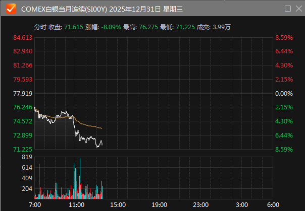 上证报中国证券网讯(记者朱妍)12月26日,COMEX白银期货价格涨逾11%,随后两个交易日又分别下跌7.2%和上涨7.88%。12月31日,COMEX白银期货价格盘中再度跳水,截至13点43分发稿,其跌幅已超过8%。