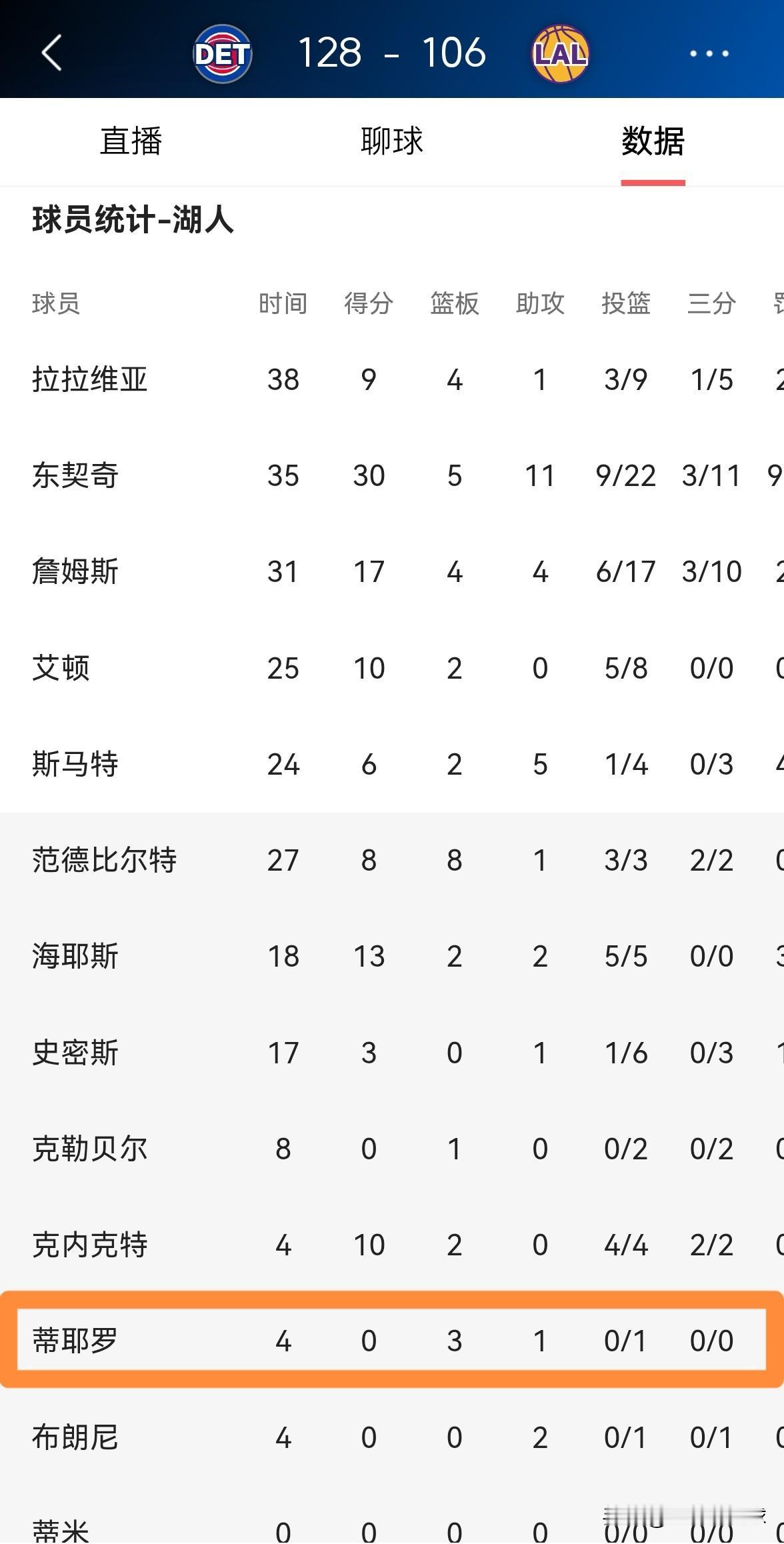 我强烈建议湖人新秀蒂耶罗主动申请交易!在今天湖人主场以106:128惨败于活塞的比赛中,蒂耶罗仅仅在垃圾时间里替补出战4分钟,投篮1中0没有得分,不过有3篮板1助攻1盖帽,他的场上正负值为+4。 在我看来,如果蒂耶罗继续留在湖人只会断送了自己的职业生涯,他应该主动向球队申请交易,进而加盟一支能够获得稳定出场时间的球队。