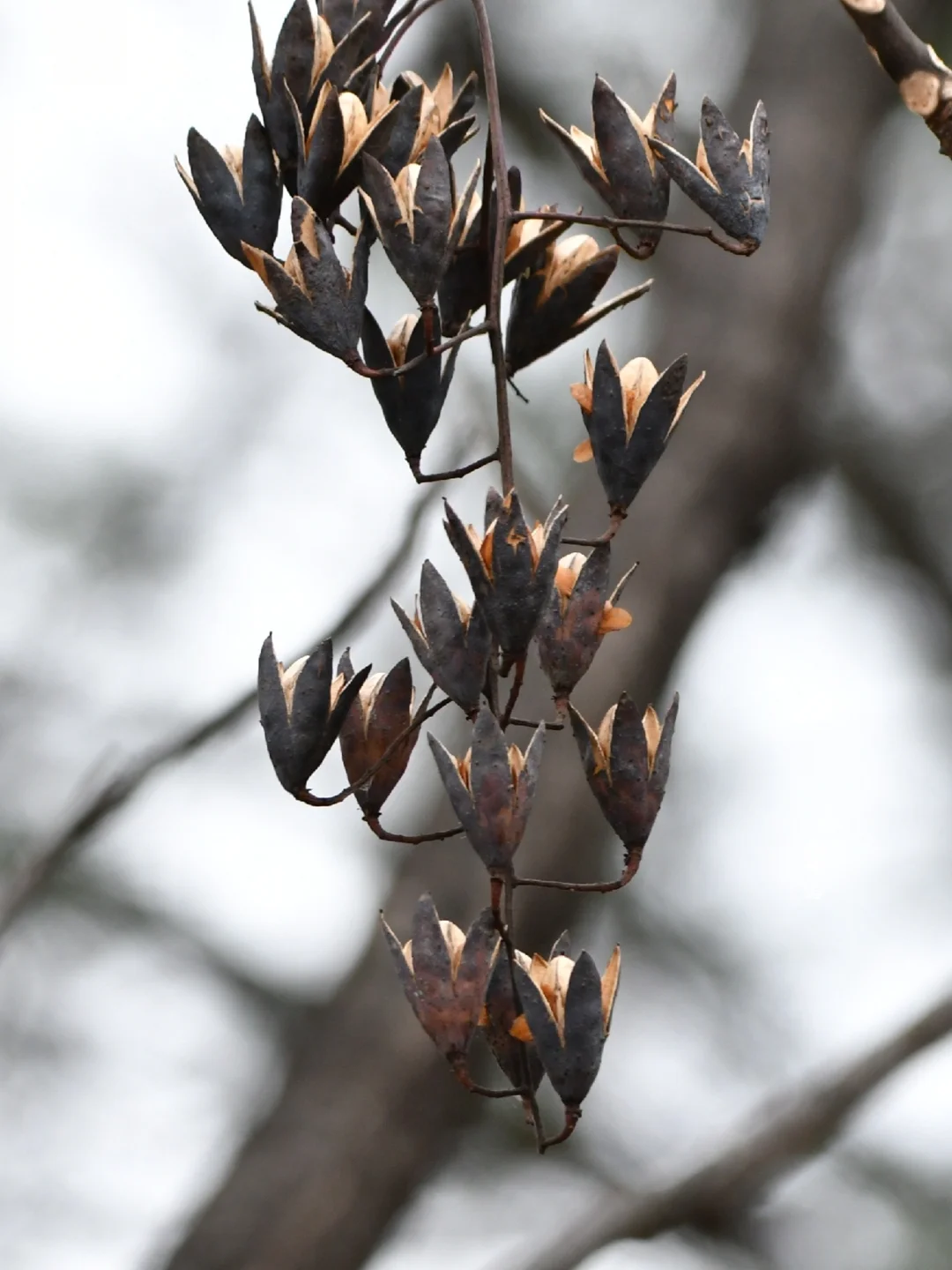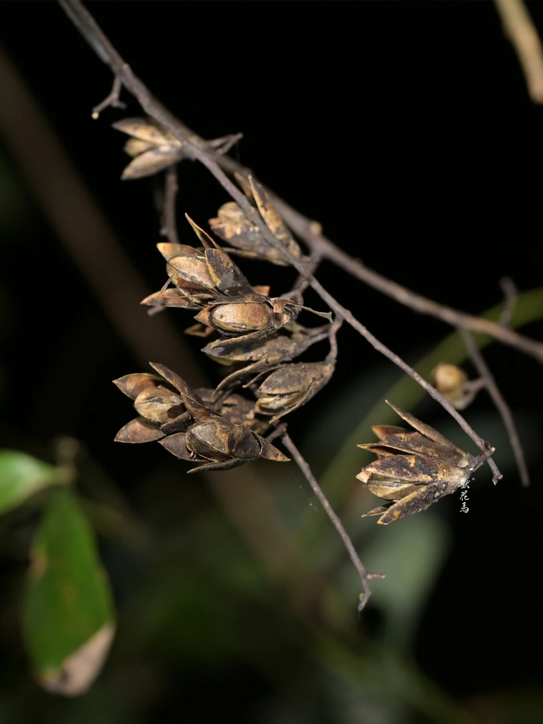 ✨ 果实似风铃:果皮开裂5瓣,黑褐色纹理如雕花,内藏薄翼种子,轻盈半透明
