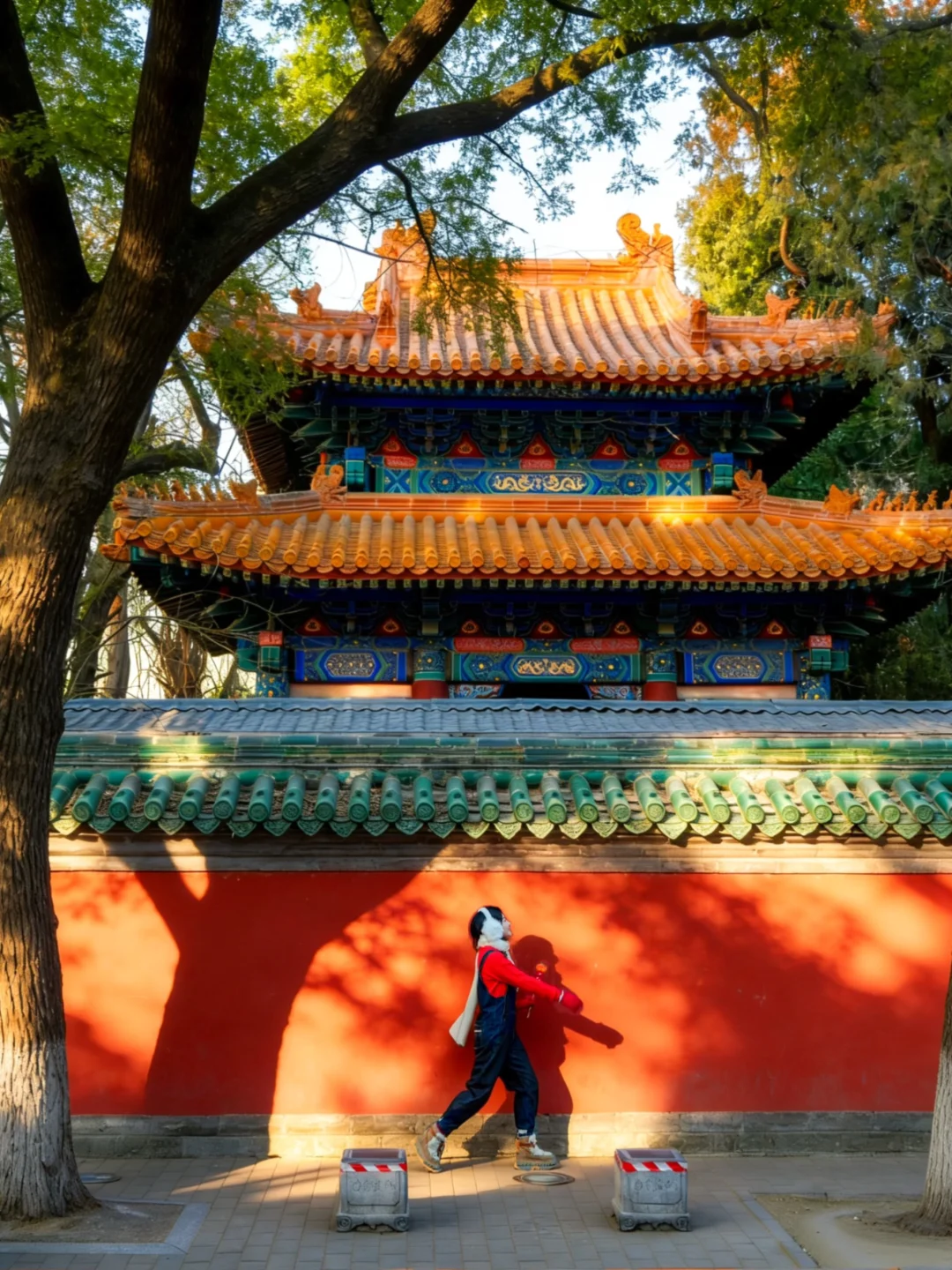 街道两侧是红色宫墙,阳光下光影斑驳,拍照超美!