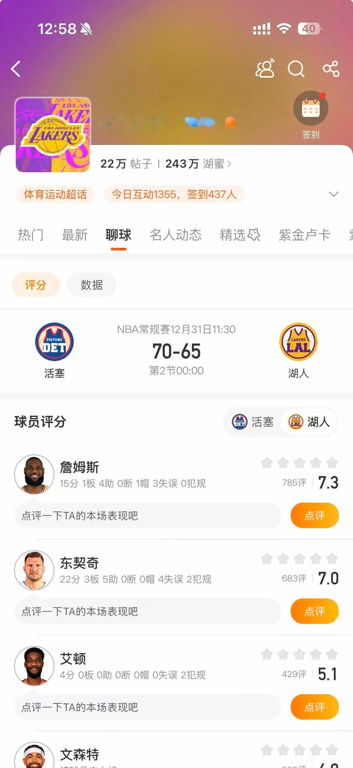 活塞vs湖人 半场结束,活塞70-65暂时领先湖人。进入球队超话洛杉矶湖人 和底特律活塞 对球员上半场的表现进行评分!