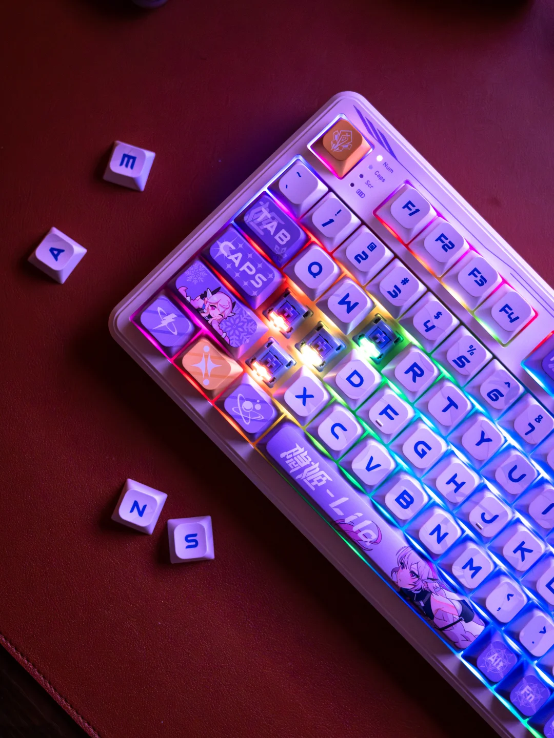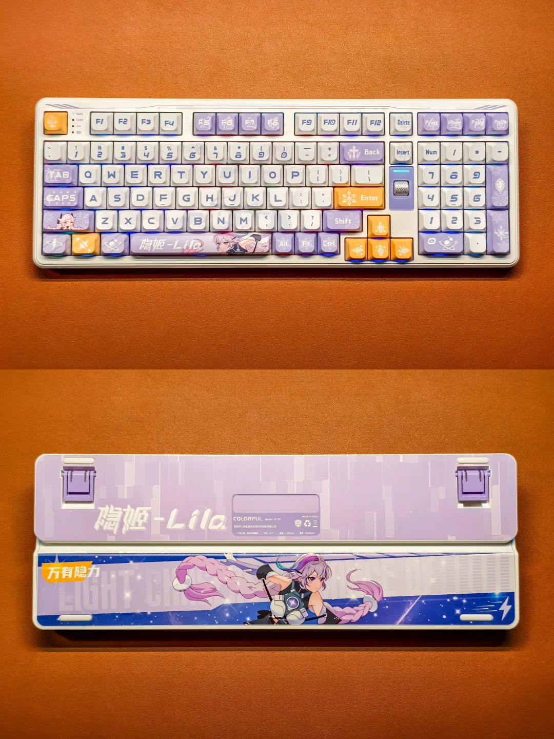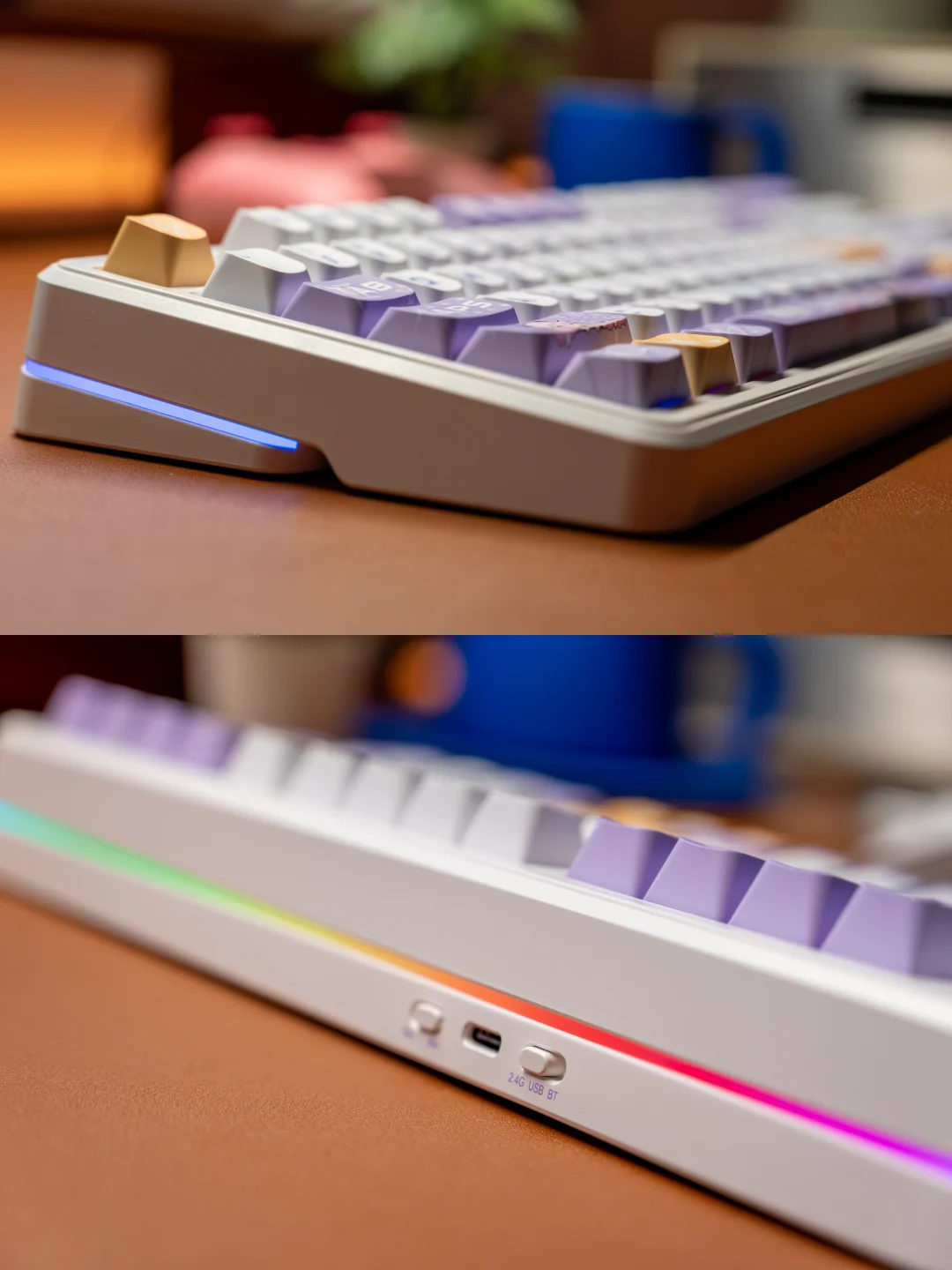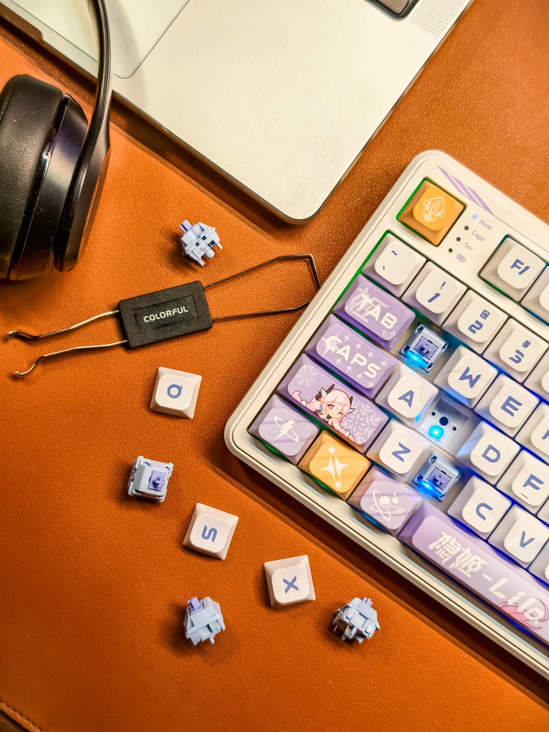 为自己的一份欢喜“添砖加瓦”。选择了七彩虹青羽98Pro游戏机械键盘,梦幻又高级的紫白色主调,搭配上1600万可自定义的幻彩RGB灯带,每一处细节都透着设计师的巧思。
