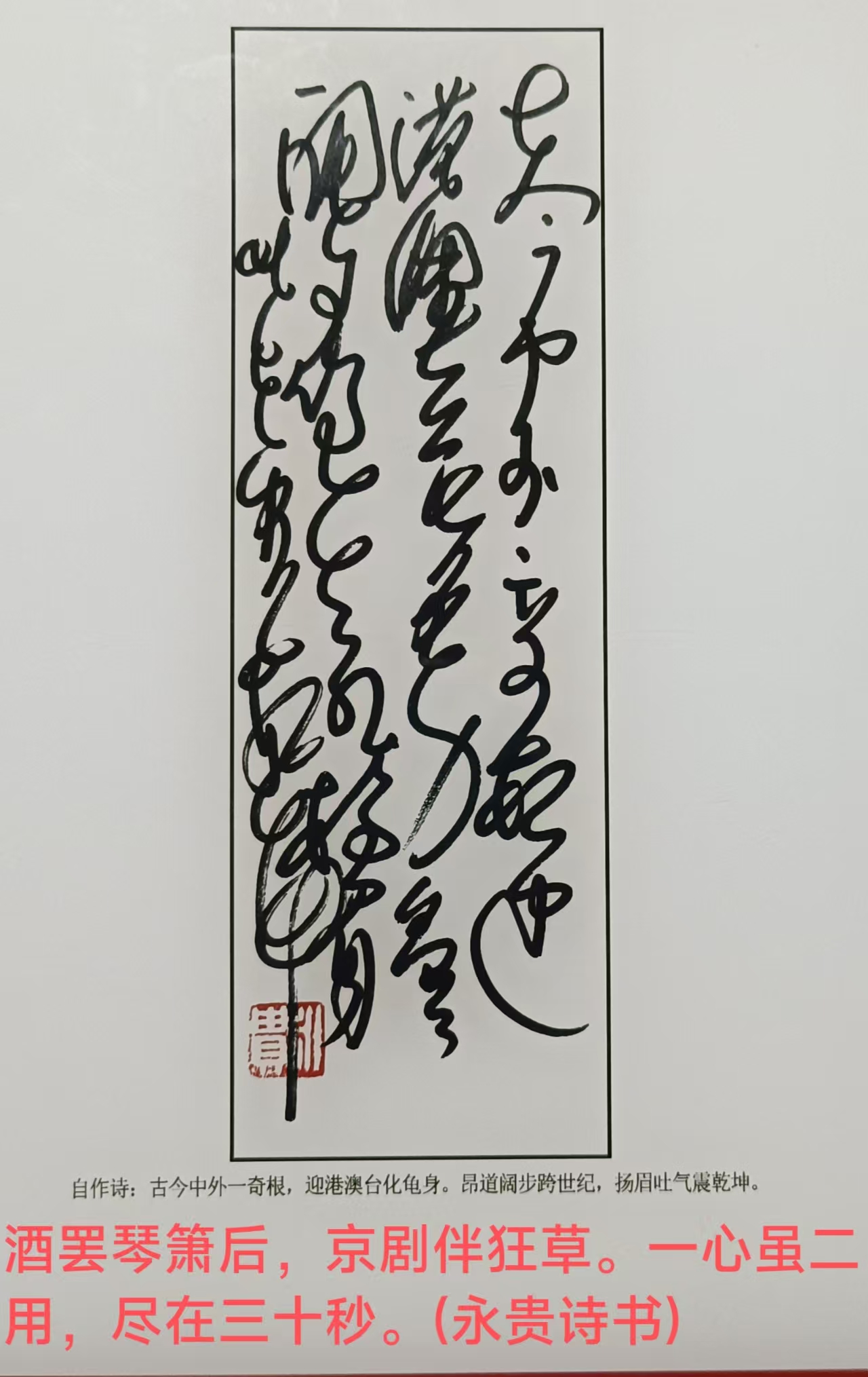 高永贵的“狂草”如诗、如舞,亦如画,笔意、笔态、笔势,如虬枝之老松、如天造之奇石、如飞天之仙鹤、如捕食之猎豹。一幅幅作品或气势豪纵、或绚烂多姿、或意象澎湃,点画有高峰坠石之势,线条有万岁枯藤之状,结体有苍茫雄浑之貌,堪称一绝,实属独创。
