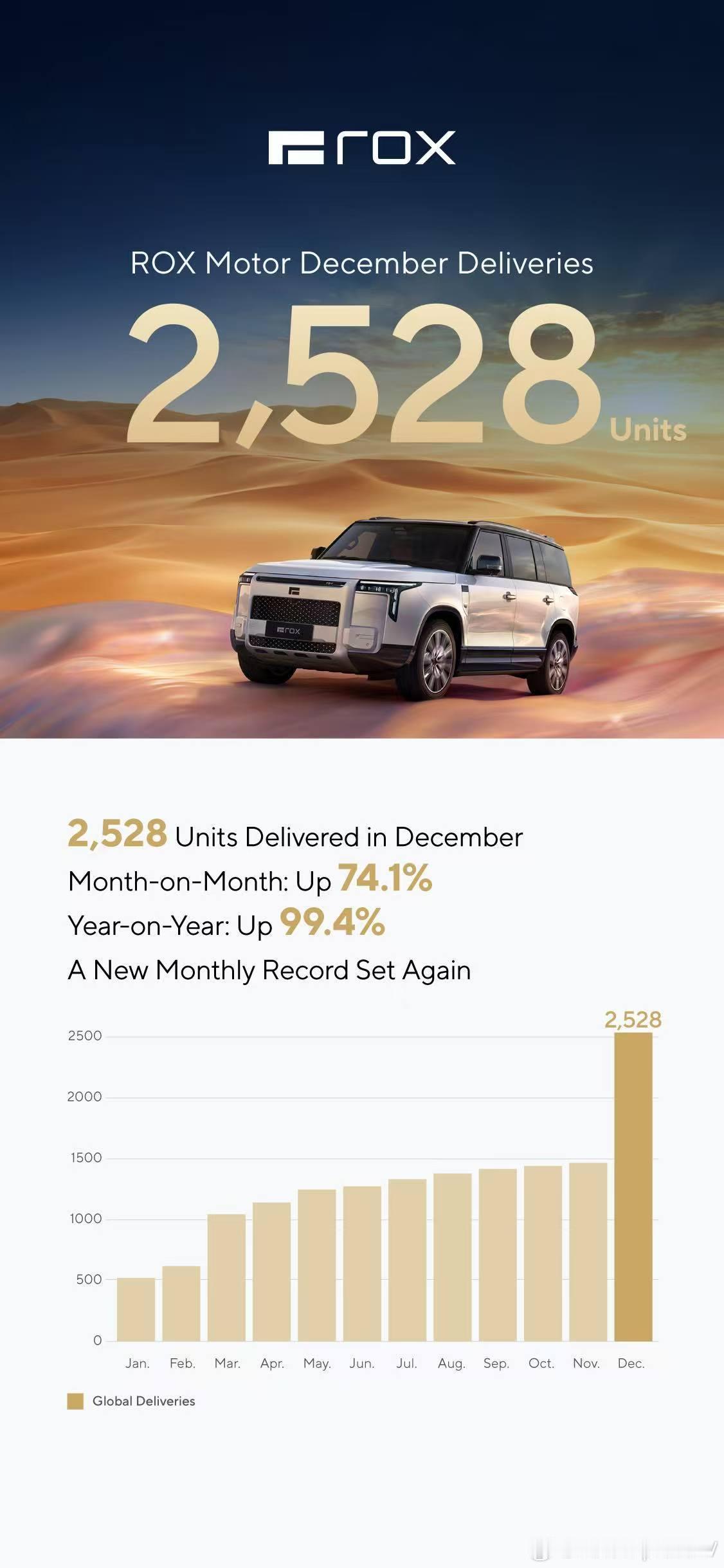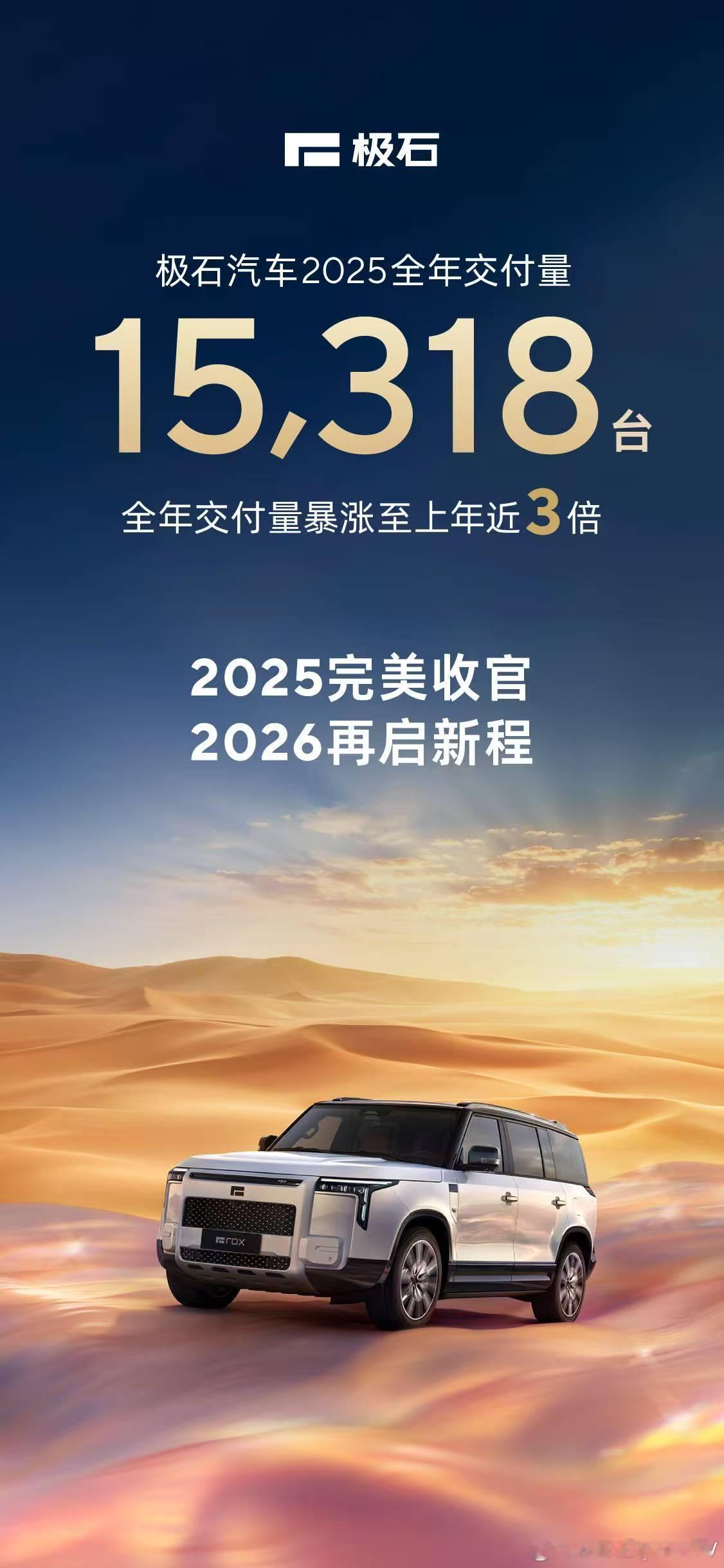 极石汽车2025年的进展与成果分享~1、12月销量再破新高,全年增长势头强劲12月单月交付2528台,环比增长74.1%,同比增长99.4%,再创月度销量纪录。2025年全年累计交付15318台,同比增长近3倍,实现跨越式提升。2、全新旗舰ADAMAS国内、海外相继上市,反响热烈12月28日,极石ADAMAS中国版正式上市,上市权益价33.49万–34.49万元。此前,极石ADAMAS已在阿联酋、沙特、卡塔尔、科威特、阿曼上市,海外售价超8万美元,市场反响热烈,首月订单即突破2000张。3、持续深化全球化布局、完善全地形矩阵截至2025年12月,极石汽车已进入中东、中亚、非洲等全球超过40个国家和地区,全球化步伐稳步推进。产品方面,将保持每年至少一款新车的节奏,持续完善全地形产品矩阵。基于全新平台的下一代产品已进入研发快车道。