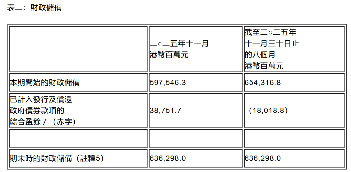 财政储备在2025年11月30日为6,363亿港元。