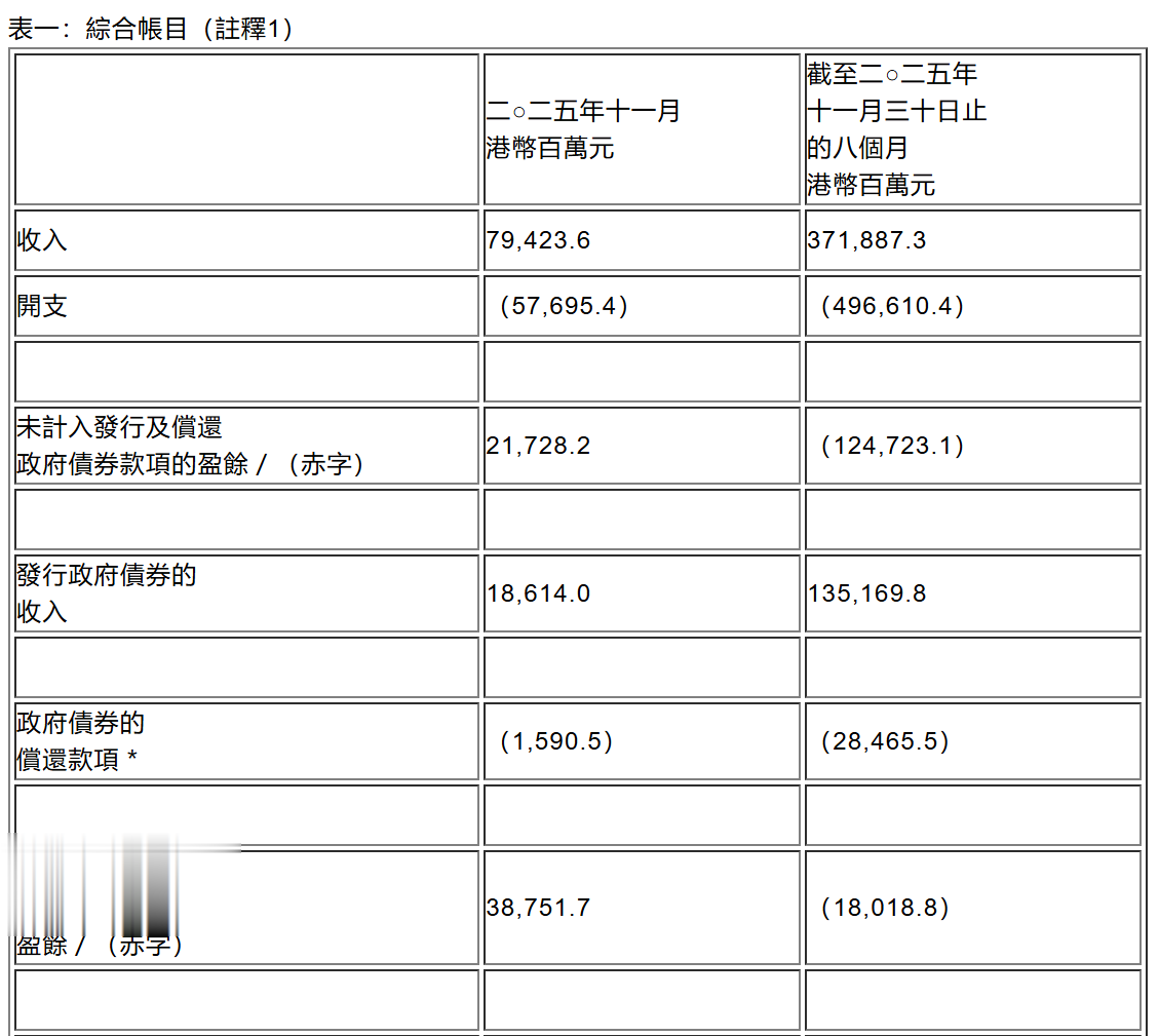 港府发言人表示,截至11月份的赤字较10月份减少,主要是由于薪俸税及利得税等主要收入均大多在财政年度的后期收取。本财政年度的修订预算将与2026至27年度《财政预算案》同时公布。