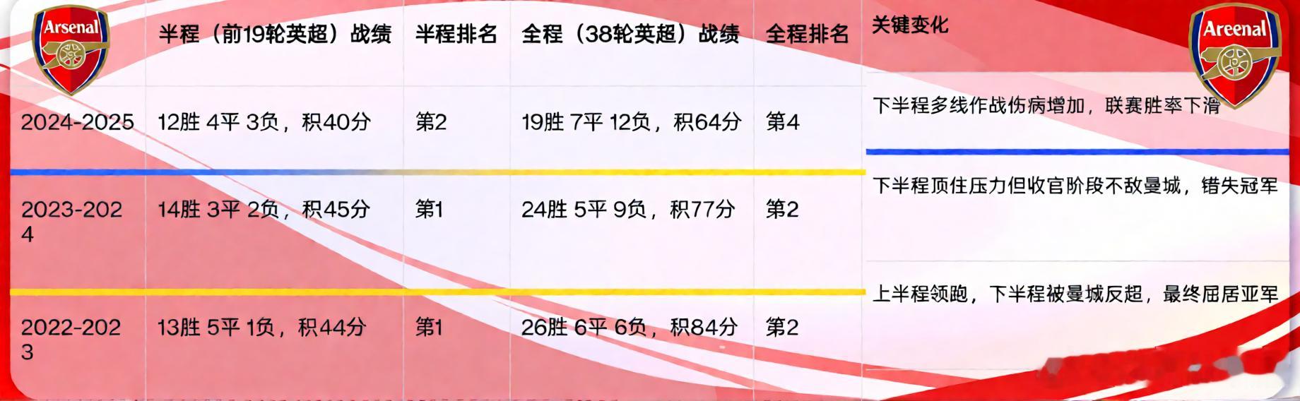 英超的赛程过半了!阿森纳刚刚战胜阿斯顿维拉,目前14胜3平2负45分排在第一,不过阿森纳想要拿到联赛冠军恐怕没那么容易,因为阿森纳被称作是半程王,前几个赛季他们在上半程踢得非常好,但是进入后半程后继乏力,被曼城给反超最终遗憾丢冠。现在阿森纳在先赛一场的情况下,只领先曼城5分,只有一点点优势,很多球迷都在担心阿森纳会重蹈覆辙,不知道本赛季他们能否逆天改命。