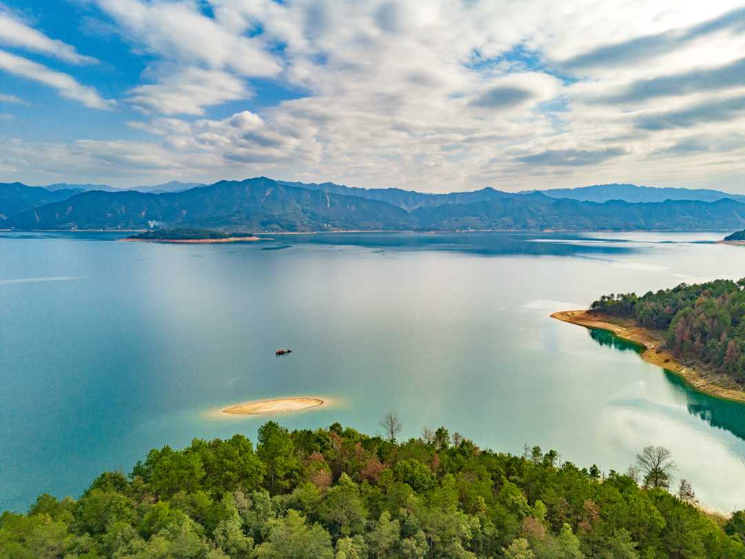 12月29日,湖南省郴州市资兴市白廊镇东江湖水面如镜,翠岛、游船、蓝天、白云相映成趣,构成了一幅秀丽的生态画卷。