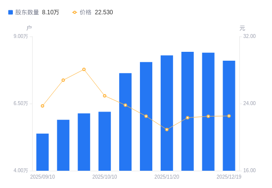 日期A股户数(户)流通A股户均持股数(股)户均持股市值(万元)2025-12-198098923324.7252.552025-12-108397322495.8750.592025-11-288431822403.8250.012025-11-208297722765.8947.602025-11-108047923472.5352.812025-10-317635224741.2758.932025-10-106198330476.8375.982025-09-306134930791.7986.462025-09-195898832024.2485.822025-09-105384835081.0783.25