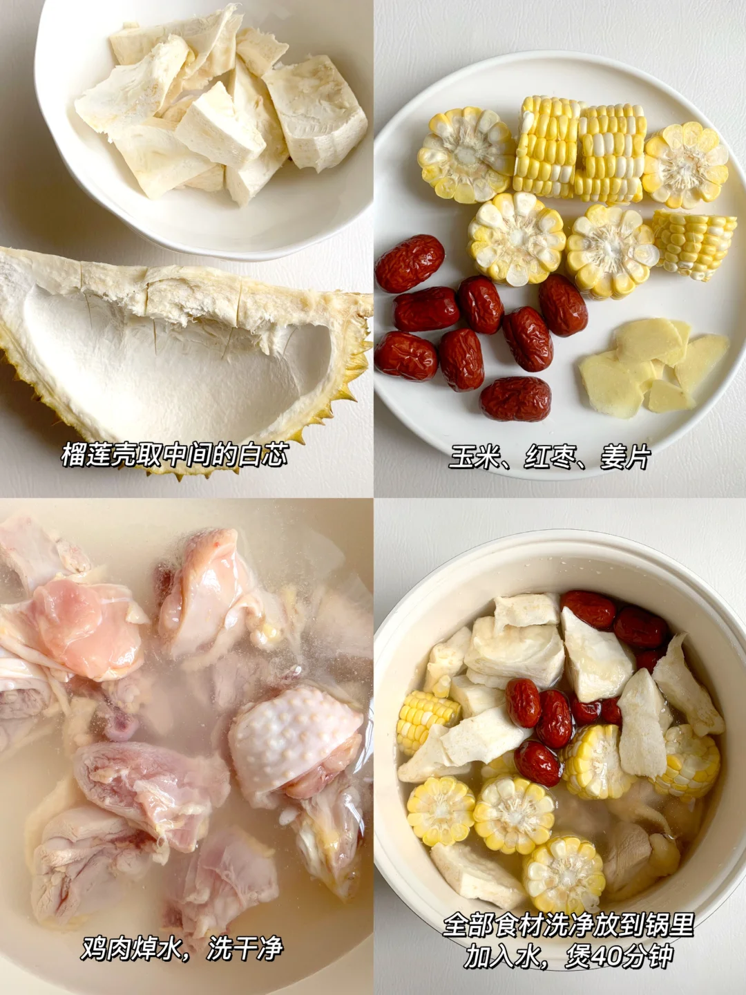 爱吃榴莲的姐妹们不要错过这个汤,开榴莲盲盒,吃榴莲真的好幸福,榴莲吃多容易上火,榴莲壳却是下火的好东西,榴莲用来煲鸡肉汤喝真的绝了,清补益气。 - 🌟食材 鸡肉、榴莲壳、玉米、红枣、姜片 🌟做法 1⃣️榴莲壳取出白芯后切小块,鸡肉焯水洗干净,玉米切块 2⃣️鸡肉,榴莲白芯、玉米、红枣、姜片放入电压力煲中,加入适量水,煲40分钟,出锅撒少许盐调味即可 🌈用炖盅的炖的话,需要炖2个小时哦 🌈这个汤推荐一岁以上的宝宝们