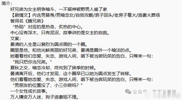 替身文学!自我攻略!雄竞修罗场!万人嫌变万人迷!这本好看到想失忆了再看一遍!!!《热陷》by卜鸣书评:这个作者的所有书我都看过,但是我最喜欢这一本!这本在我看来好像没什么雷,但是还是排一下吧:1.女主前期有点卑微,女主控的话慎入哦。2.其中有一个男主不洁,但是在很后期才有他的🥩3.其中一个男主有身体残疾,因为被报复缺了一条腿。介意慎入哦!!! 这本文还挺长的,我尽量精简: 女主算是美强惨类型,出身小地方,母亲生得很美,父亲一直患得患失,动不动发疯闹事,一家人成了镇上笑话。爸妈都没空管女主,导致女主过得很惨,邻居男1主动示好,让她上门吃饭很照顾她。后来母亲被父亲泼偷人脏水,女主被所有同学孤立,也只有男1陪在她身边,当她的好朋友。而且男1性格温柔,对女主一腔赤诚,女主也爱上了男1,但是也一直在默默暗恋。 男1长得好,女主自学摄影,帮他拍的照片在网络红了,男1亲爸找上门,原来他是流落在外的小少爷。男1被接回大城市,女主努力学校考到男1所在城市,两人再次会面。女主以为两人能顺其自然走到一起,可不论谁问起两人关系,男1都立即说是兄弟。女主也一直把暗恋埋在心里。 男2和女主男1来自一个地方,身世也挺惨的,亲爸矿难去世亲妈改嫁,没人管他。此前虽然和女主一个学校,但没啥交集。男2精于算计,看男1单纯,蓄意接近,成为他的好哥们儿,踏入上层圈子,自然和女主有了接触。一次女主醉酒,把男2认成男1,有了一夜关系。此后,两人人前是疏离的老乡,人后是缱绻p友。男1完全不知情,还想让女主男2多交流熟悉一下。 男3也是男1兄弟,真正的豪门阔少,花花公子一枚,身边女人没断过。一直觉得女主完全没有女性魅力。反正以男1为圆点,女主和几个男人有了牵扯,但明面上谁都不喜欢他,都把她当男人看待。 直到开篇不久聚餐,女配到来,男1说她是自己在追求的女神。女配就是很漂亮、小公主的类型,女主害怕对方介意,男1还故意和女主避嫌。女主彻底心死,明白原来不是男1分不清感情,是他从始至终没有看上自己。从这里开始,女主决定退场,结束这十几年的暗恋……(ps:女配是好人) 但男1习惯女主的陪伴,也没有察觉女主的远离,相处还是毫不避嫌,女主害怕自己心软,和男2达成约定假扮男友,结果男2发疯揭穿了女主的计划,导致女主很难堪,完美男4上场。 女主是一个网黄,因为现实生活中打扮很中性,所以她在网上展现自己的魅力。男4是女主的粉丝,在网络上有一些亲密交流,因为前面被戳破假扮男友的事情,所以女主找到了男4让大家相信她真的有男友了,可这个时候男1男2却开始心里不得劲了。 女主彻底将男1翻篇,专注和男4发展感情。男4挺神秘的,前期和女主电话视频训诫,年上魅力满满,对手戏贼拉丝!男4一步步掉马过程极其有看点!居然是大总裁,还是男3的舅舅嘿嘿!看似成熟精英,实则因为一条腿有点残疾,内心挺自卑,不真正见面也是怕女主嫌弃自己。 另一边,女主彻底退出自己的世界,受伤女主也毫不在意,男1慌了。男1属实在感情中有点愚蠢,加上还有男2男3从中作祟,给他灌输女主喜欢女人的观念,男1从没往其他方向想过。至于喜欢女配,只是觉得对方符合他的择偶要求罢了,完全不是真正的心动。男1后知后觉,认错、挽留,可女主很果断,完全不回头,后面男1得追妻两三百章哈哈。 至于男2,人设最为复杂,嘴巴真毒,羞辱了女主好几次,结果这小子藏得最深,暗恋了女主十年。他接近男1根本不是为了利益,只是为了女主。他装得毫不在意,背地里为她做了很多,甚至赌上自己的前途。后期失控、破防、坦诚心意的桥段,贼精彩!一边看女主虐他我很爽,但是又有一丝丝的心疼他。 男3这条线非常搞笑,都不用女主出力,妥妥自我攻略。误会女主对他有意思,又意外发现女主身材挺好,风流公子哥就有了几分兴趣。可他想着兔子不吃窝边草,一次次劝女主别在自己身上浪费时间。女主??你在说什么屁话?在不断自我脑补中,大少爷先一步沦陷,后期更是浪子回头,再不沾花惹草。 四个男人差不多都收服了,可女主不想吃回头草,努力搞事业。当女主变得足够好,优秀的男人一个个往前凑,中间女主和几个男配有亲密关系,(其他男配我都很喜欢,感觉很有意思,其中还有一对亲兄弟,兄弟盖饭大家懂得。)四个男人干看着嫉妒得牙痒痒。当然,也少不得修罗场,兄弟内讧,甥舅相争,场面多多,女主稳坐钓鱼台哈哈~最后女主有钱有颜,4个男人甘心共同陪在她身边,男4是正宫,撒花。 全篇追妻很到位,虐男真的很上头!当然,最大看点是女主的成长,从敏感缺爱,奢望别人温暖她,到自己足够强大,一步步自救,很感动,很正能量。喜欢np、追妻火葬场、暗恋、替身文的宝宝,这篇文完全可以入,特别精彩和好看,还想看这种类型的文但是暂时还没有看到,追妻,万人嫌变万人迷,雄竞修罗场一直在我的爽点上面!!!恨不得把自己打失忆了再看一遍。