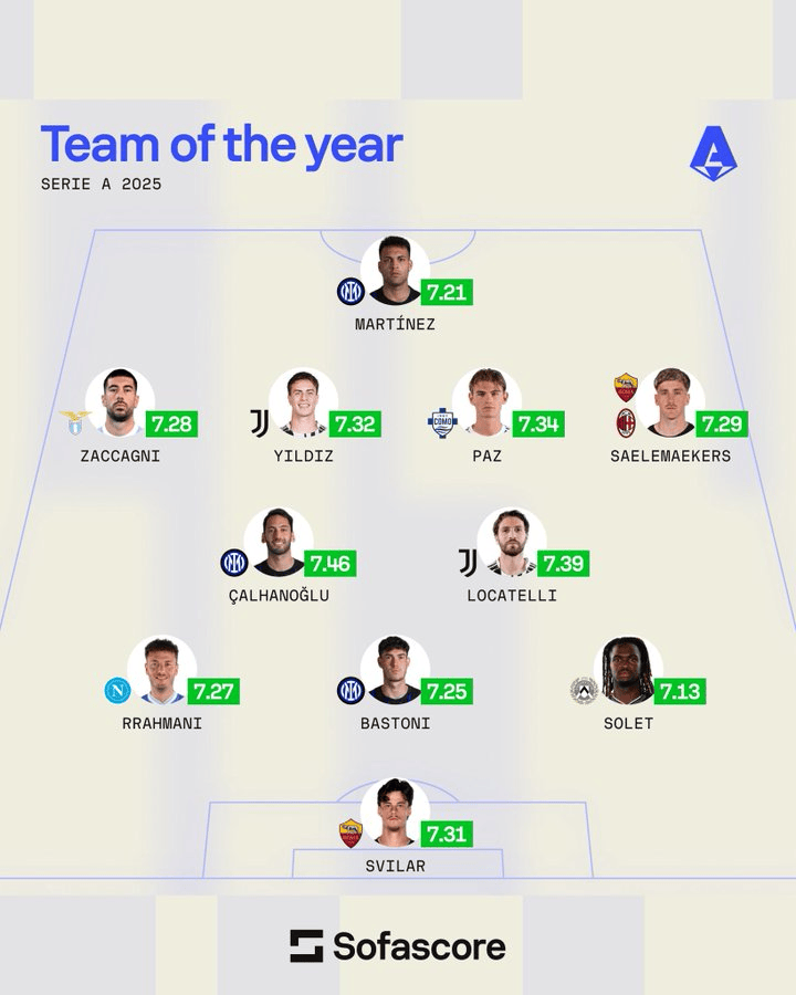 虎扑01月01日讯数据网站Sofascore今日公布了2025年意甲年度最佳阵容,基于球员全年联赛表现评分,评选出赛季最具代表性的11人阵容。