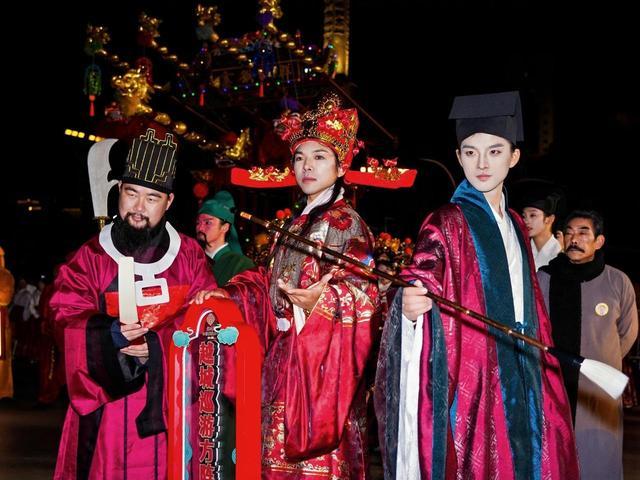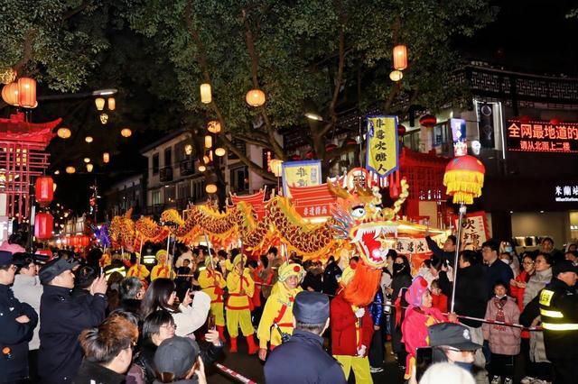 作为庙会的“重头戏”,今年的巡游方阵一亮相,便点燃了全城热情。打头阵的是新昌拔茅舞龙队,十余米长的金龙在夜色中翻腾起舞,所到之处,喝彩声此起彼伏。紧随其后的是诸暨草塔抖狮,这项起源于清代的非遗绝活,引得孩童们雀跃追逐。最受欢迎的,莫过于越地“名仕团”NPC——陆游、王羲之等绍兴历史名人“穿越”而来,与市民亲切合影互动。还有柯桥鱼灯舞、上虞河蚌舞、嵊州吹打等各区县(市)的非遗精华,让市民游客大饱眼福。
