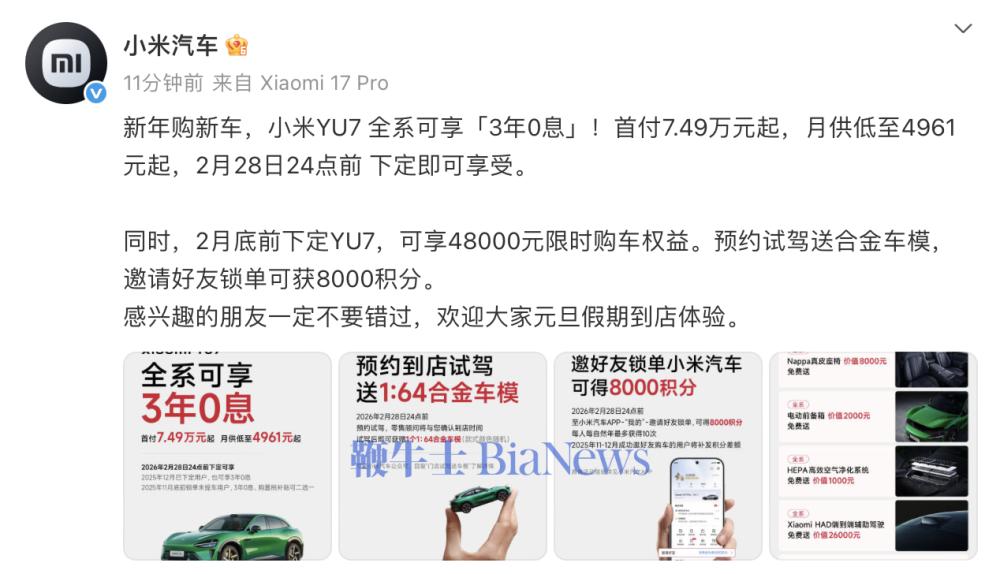 1月1日,小米汽车宣布小米YU7全系推出「3年0息」购车活动,首付7.49万元起,月供4961元起,2026年2月28日前下单订购,可享限时购车方案。