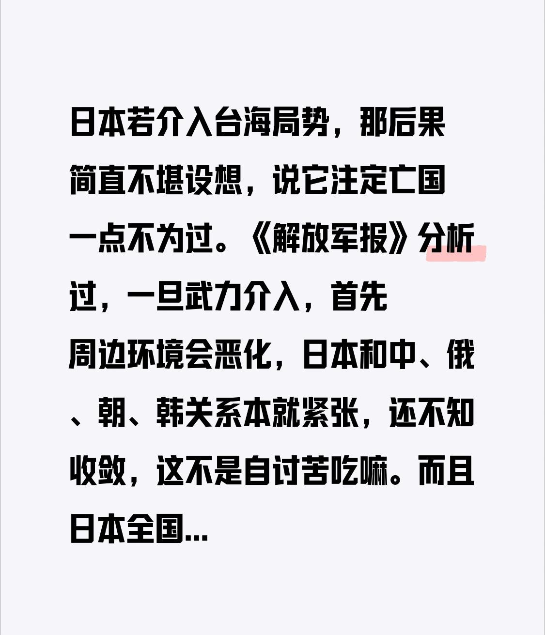 日本若介入台海局势,那后果简直不堪设想,说它注定亡国一点不为过。《解放军报》分析过,一旦武力介入,首先周边环境会恶化,日本和中、俄、朝、韩关系本就紧张,还不知收敛,这不是自讨苦吃嘛。 而且日本全国都有沦为战场的风险。它是岛国,没战略纵深,到处还有美军基地。若介入,军事基地会遭火力打击,战机可能都没起飞就被摧毁。日本学者山口二郎也说,现在挑衅中国比当年发起珍珠港行动还愚蠢。当年挑衅美国,日本最后被打得节节败退,吃了两颗原子弹。如今若介入台海,付出的代价只会更大,日本真这么干,那就是满盘皆输,离亡国不远了。