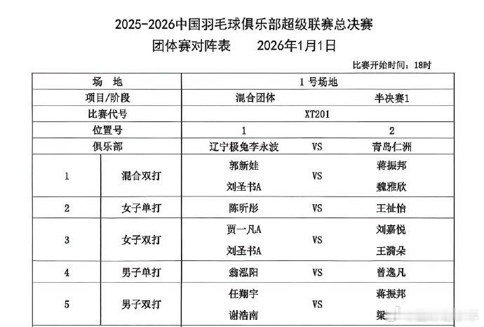 羽超总决赛今日开赛2025-2026赛季羽超总决赛将于1月1日至2日在湖南长沙中南大学体育馆举行。今日两场半决赛分别于11点和18点开赛,首先进行浙江竞体和厦门银行的比赛,晚场是辽宁极兔李永波与青岛仁洲的对决。