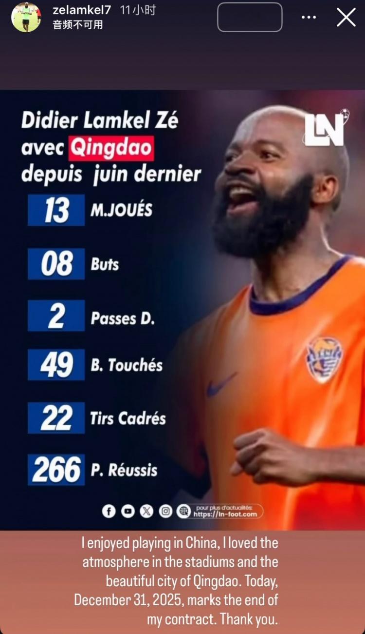 兰克尔·泽写道:“我非常享受在中国效力的时光,也非常喜爱青岛主场的热烈氛围,以及这座美丽城市。今天是2025年12月31日,这一天也意味着我与海牛的合约期限已到。谢谢你们。”