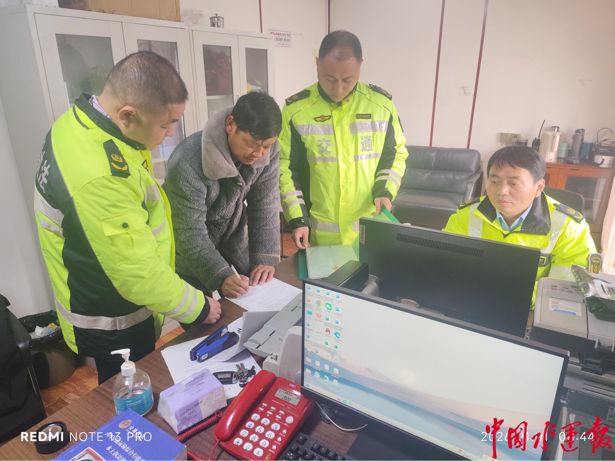 凌晨5时许,杨庄船闸执法点内已有工作人员忙碌的身影,他们身着防寒装备,仔细核对船舶通行相关文书资料,一丝不苟地开展前期准备工作;上午8时,水上中队执法人员围在工作台前,指导船民朋友们办理业务、填写登记表格,同时依托电脑系统核查船舶信息,对水上交通运营的各项环节进行严格把关。