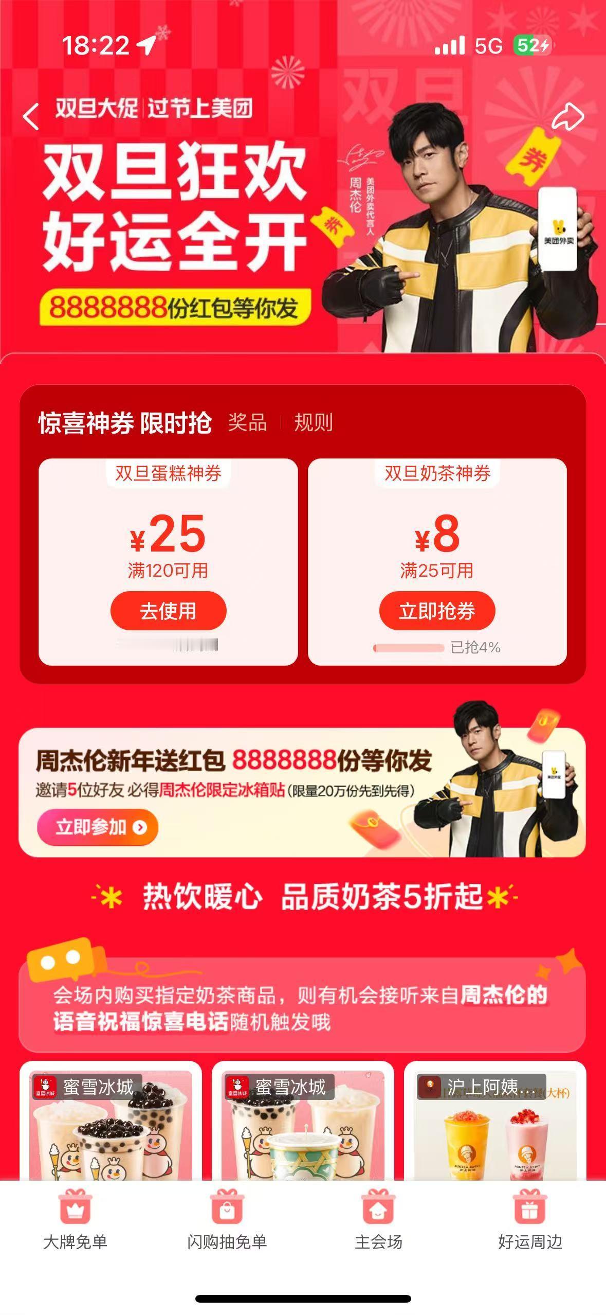 原来新年第一天有这么多讲究开年就得讨彩头!美团外卖双旦福利加码,奶茶半价喝、大餐极速送,专人直送权益限量抢~ 上APP搜“双旦狂欢”享VIP待遇,“杰伦送红包”邀好友助力,定制周边+88元红包让新年好运翻倍!