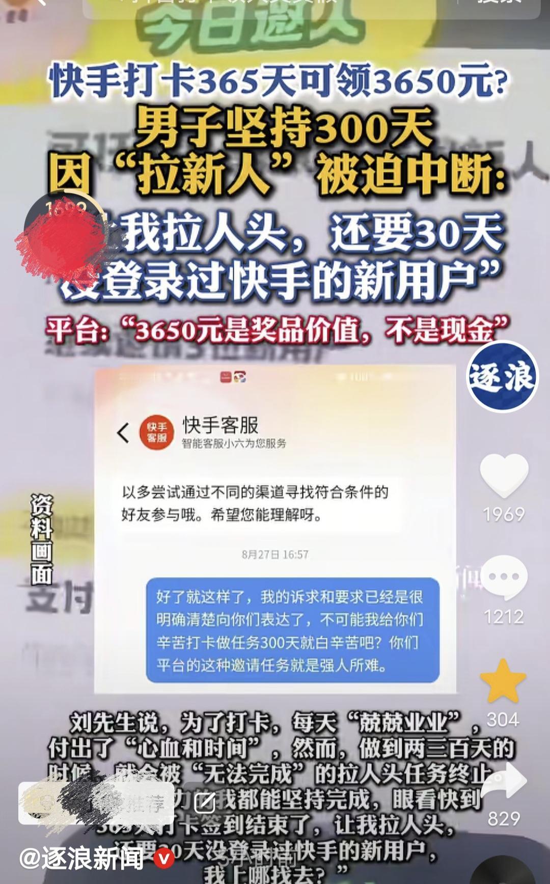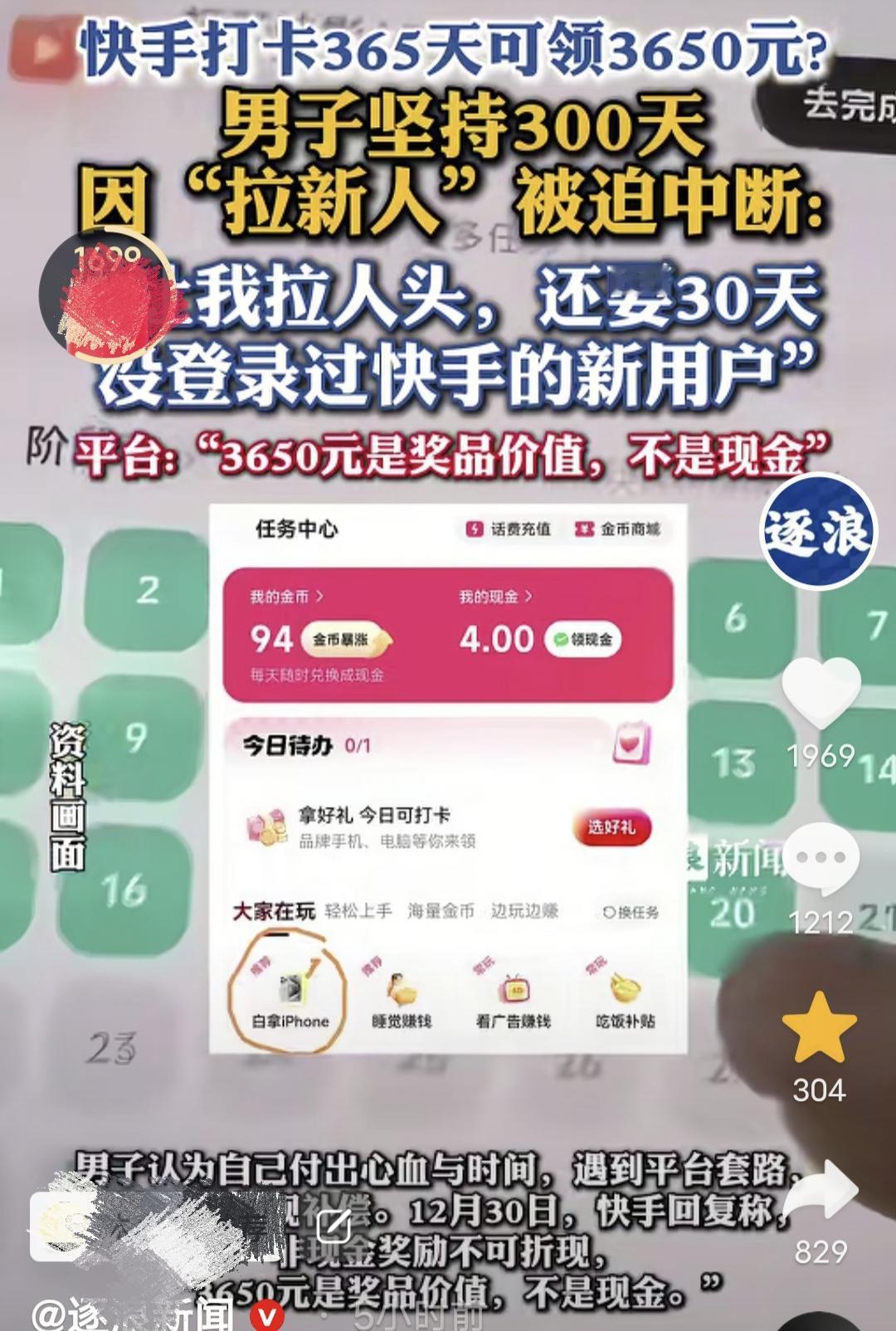 吵翻了!重庆的刘先生,平日里靠打零工维生,大部分时间都在家中照顾年迈生病的母亲,在刷快手极速版时,被“免费领手机”、“白拿3650元”的广告所吸引:活动规则简单粗暴:连续打卡365天,完成任务,奖励到手。于是,刘先生就用自己的两个快手账号,分别号加了任务,谁知,在打卡到300天时,竟出现了“拉人头”,任务被迫中断! 为了那所谓的3650元现金奖励和iPhone 16 Pro,刘先生一直每天坚持打卡做任务。起初,任务只是简单的点一点,但随着天数累积,任务量越来越大:看视频、看短剧、看广告,时长要求从几十分钟飙升至数小时。 最让人崩溃的是,系统极其“刁钻”,视频必须手动点击,一旦人离开,计时器便悄然停止。刘先生不得不死死盯着手机屏幕,每天耗时两小时以上,两部手机轮流作战,一部打卡300天,另一部打卡打卡242天! 眼看胜利在望之时,平台的任务栏里突然要求必须邀请一位“30天未登录快手的新用户”才能完成当日打卡。这一刻,刘先生懵了:去哪里寻找这种特定条件的新用户?这分明逼你放弃,或者逼你花钱。 这时,刘先生觉得这是强人所难,但又不想让自己的时间白白浪费。 于是刘先生联系了快手客服,提出了一个要求:按照已完成的工时和任务时长,进行折现补偿。他甚至不需要全额,只求平台认可他的劳动价值。 然而,快手的回复直接:非现金奖励不可折现,断签即失败。 更让刘先生气愤的是,他参加的明明写着“3650元现金奖励”,在客服口中,这笔钱的性质变了。快手客服回应称:“3650元是奖品价值,不是现金。”也就是说,即便你完成了,发的也是“等价实物”,而且现在你没完成,就一分钱没有。至于为什么要拉人?客服轻描淡写地表示:“任务由系统随机下发,为了保障公平性。” 对此有网友说:“这种活动并不是非玩不可,一开始是签到,后来从看一个视频到多个视频,我就觉得是套路,不参与了。” 也有网友说:“为什么一开始不把规则亮明呢?虽是营销策略,也不能层层加码,让坚持下去的人被迫放弃,平台应该讲诚信,不应欺骗消费者。” 还有网友说:“野心太大了,其实30天任务最好,完不成断签也无所谓,我成功了一个20元的和90天66元的,但还是太累了,不弄了。” 说实话,这种“钓鱼式”营销,吃相未免太难看了。平台把规则握在手里,当消费者觉得有希望时,再设一个你根本跳不过去的门槛。 当你完成了前300天的任务,你已经为平台贡献了足够的点击量、观看时长和日活数据,你的商业价值其实已经被榨得差不多了。这时候再让你去拉新用户,不仅难如登天,更是平台为了逃避最终兑现大奖而使出的“杀手锏”。 对于像刘先生这样的用户或许不在少数,只是想用时间来换取“奖励”,可谁知越不过平台的“门槛”,对于“奖励”只能可望不可及。 这件事也给所有沉迷于“做任务领红包”的人提了个醒:天上不会掉馅饼,只会掉陷阱。 当我们在屏幕前为了那几块钱、几毛钱死磕时,或许应该问问自己:到底是我们在薅平台的羊毛,还是平台在“薅”我们?