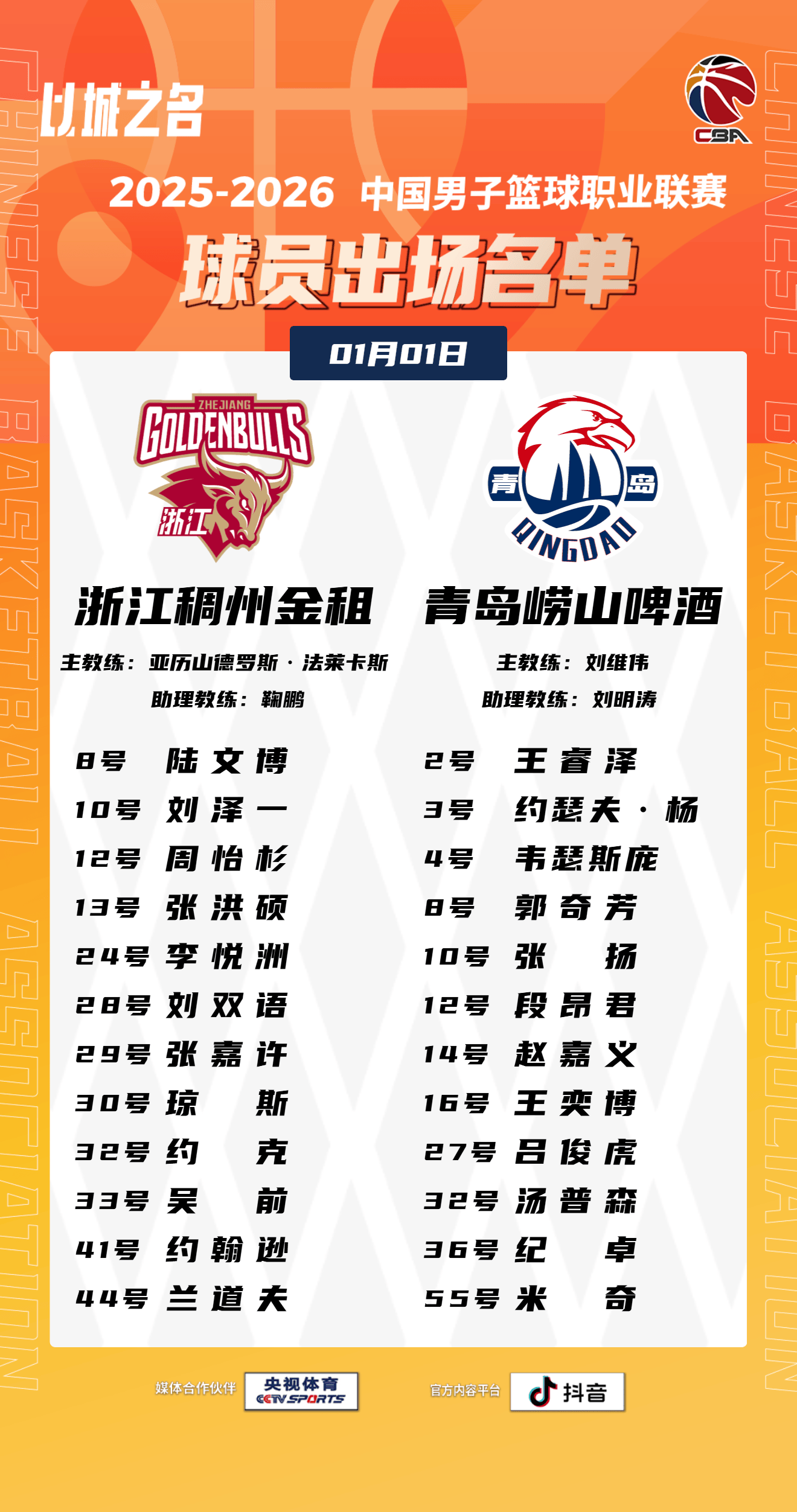 虎扑01月01日讯今晚CBA常规赛,浙江对阵青岛的大名单已经出炉。