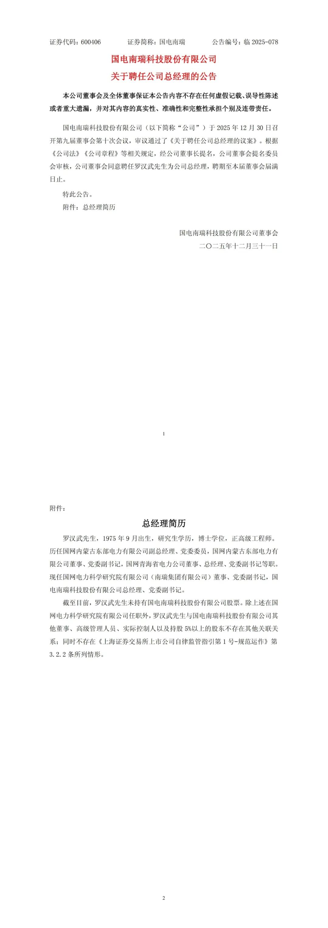 据上海证券交易所消息,国电南瑞科技股份有限公司于2025年12月30日召开第九届董事会第十次会议,审议通过了《关于聘任公司总经理的议案》。根据《公司法》《公司章程》等相关规定,经公司董事长提名,公司董事会提名委员会审核,公司董事会同意聘任罗汉武先生为公司总经理。