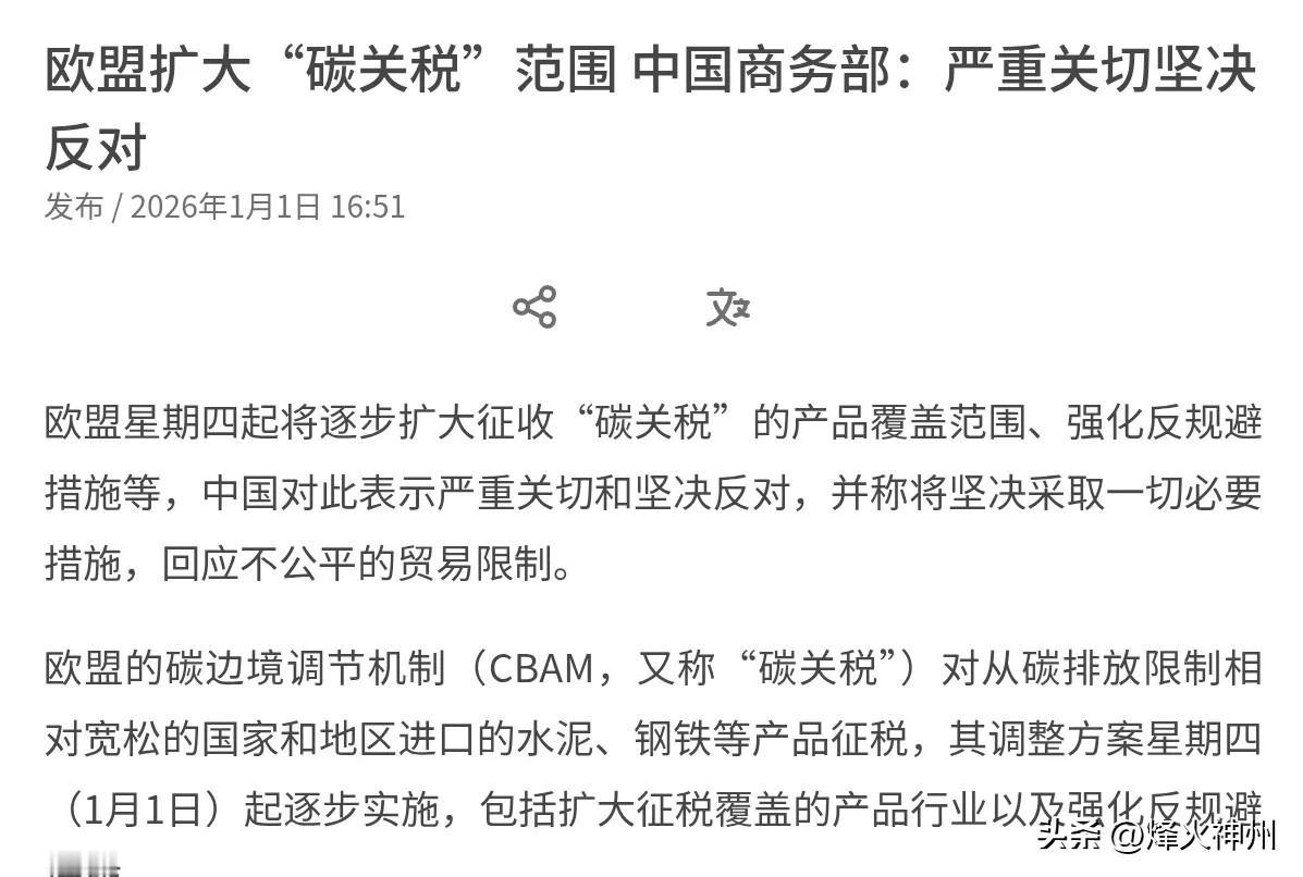 1月1日,欧盟正式开始逐步扩大碳边境调节机制(CBAM,即“碳关税”)的产品覆盖范围,并强化反规避措施。针对此举,中国商务部明确表达严重关切与坚决反对的态度,同时表示将采取一切必要措施,回应这一不公平的贸易限制。 评几句: 欧盟扩碳关税,贸易保护的幌子藏不住了! 欧盟新年第一天就扩大碳关税范围,这哪里是推进碳中和,分明是打着环保旗号搞贸易保护! 碳关税看似是为了全球减排,实则是给发展中国家的出口产品设下贸易壁垒。欧盟对水泥、钢铁等产品加征碳关税,瞄准的正是中国等发展中国家具有竞争优势的制造业领域,这种做法违背了世贸组织的公平贸易原则,也让全球产业链的公平性打了折扣。 中国商务部的坚决反对,既捍卫了本国企业的合法权益,也戳破了欧盟“环保至上”的伪装。要知道,减排从来不是单边设限的借口,更不该成为贸易保护的工具。欧盟若执意推行这种不公平的贸易政策,不仅会加剧中欧贸易摩擦,还会拖累全球碳中和的合作进程。 真正的全球减排,需要的是各国协同制定公平的规则,而非搞“双重标准”。中国采取的必要反制措施,既是对不公平贸易的回应,也是在为全球贸易的公平秩序发声!