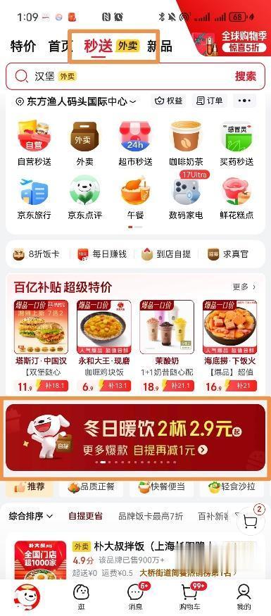“京东自提”依托京东平台生态,联动全国数万家连锁餐饮品牌,消费者在京东app秒送频道或京东外卖app选购商品时,可选择“到店自提”选项,完成支付后按约定时间前往门店取货,全程无需等待骑手配送。该模式不仅免去配送费用,爆品平均节省3–8元/单,还大幅缩短履约时间——热门门店商品最快5分钟即可备妥。