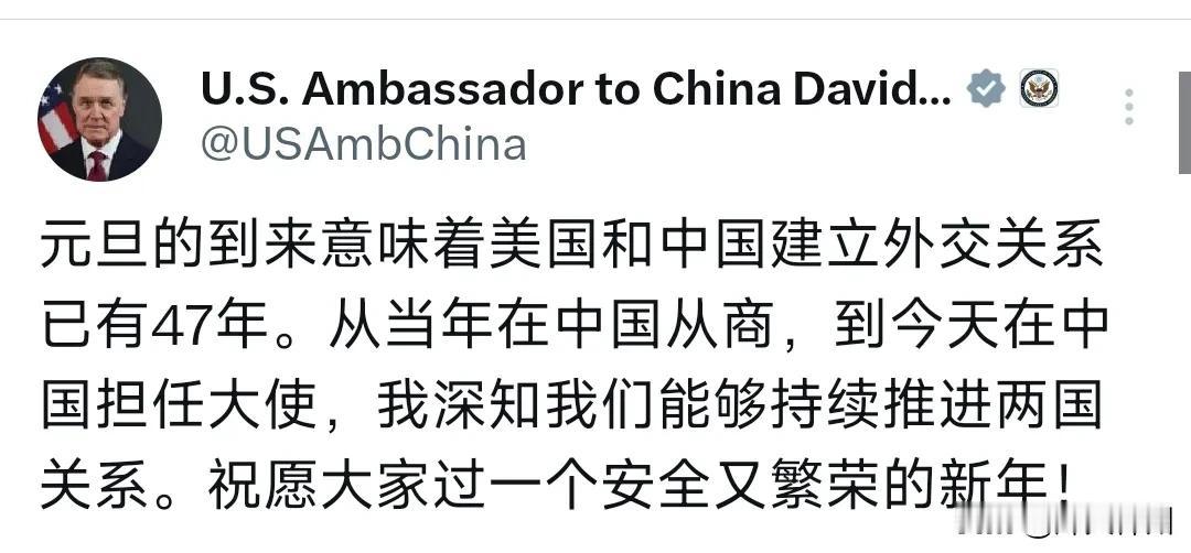 美国驻华大使庞德伟今天(1月1日)发文写道:“元旦的到来意味着美国和中国建立外交关系已有47年。从当年在中国从商,到今天在中国担任大使,我深知我们能够持续推进两国关系。祝愿大家过一个安全又繁荣的新年!” 评几句: 47年建交节点,美国大使的新年祝福该配真行动! 中美建交47周年之际,美国驻华大使庞德伟的新年发文满是温情,提及在华经商与履职经历,表态要“持续推进两国关系”,这番话语确实契合双边关系的应有航向。 但47年的外交历程早已证明,中美关系的推进从不靠空话,而是靠相互尊重与实际行动。从“上海公报”到中美建交公报,三个联合公报奠定的核心共识,本质是尊重彼此核心利益与重大关切。可近期美方的动作却与“推进关系”背道而驰:庞德伟履职后不久便参与“四方安全对话”相关协调,配合美方搞排他性“小圈子”;美方一边谈合作,一边加码对华技术封锁、推进对台军售,甚至制裁中企,这种“说一套做一套”的行径,严重消耗着双边互信。 更值得关注的是,这位自称“深知两国关系”的“中国通”,曾是推动对华强硬政策的“鹰派”,其过往对华强硬主张与如今的温情表态形成鲜明反差。中方早已明确期待:驻华大使应做“可信的沟通者、分歧的调解者、合作的促进者”,而非白宫战略的“传声筒”。 新年祝福虽暖,却抵不过现实行动的分量。中美合则两利、斗则俱伤是铁律,47年的外交遗产更值得珍惜。若美方真愿推进关系,就该停止单边制裁与干涉内政,回到三个联合公报的轨道上,用实际行动回应“安全繁荣”的共同期许,而不是让温情祝福沦为空洞的外交辞令!