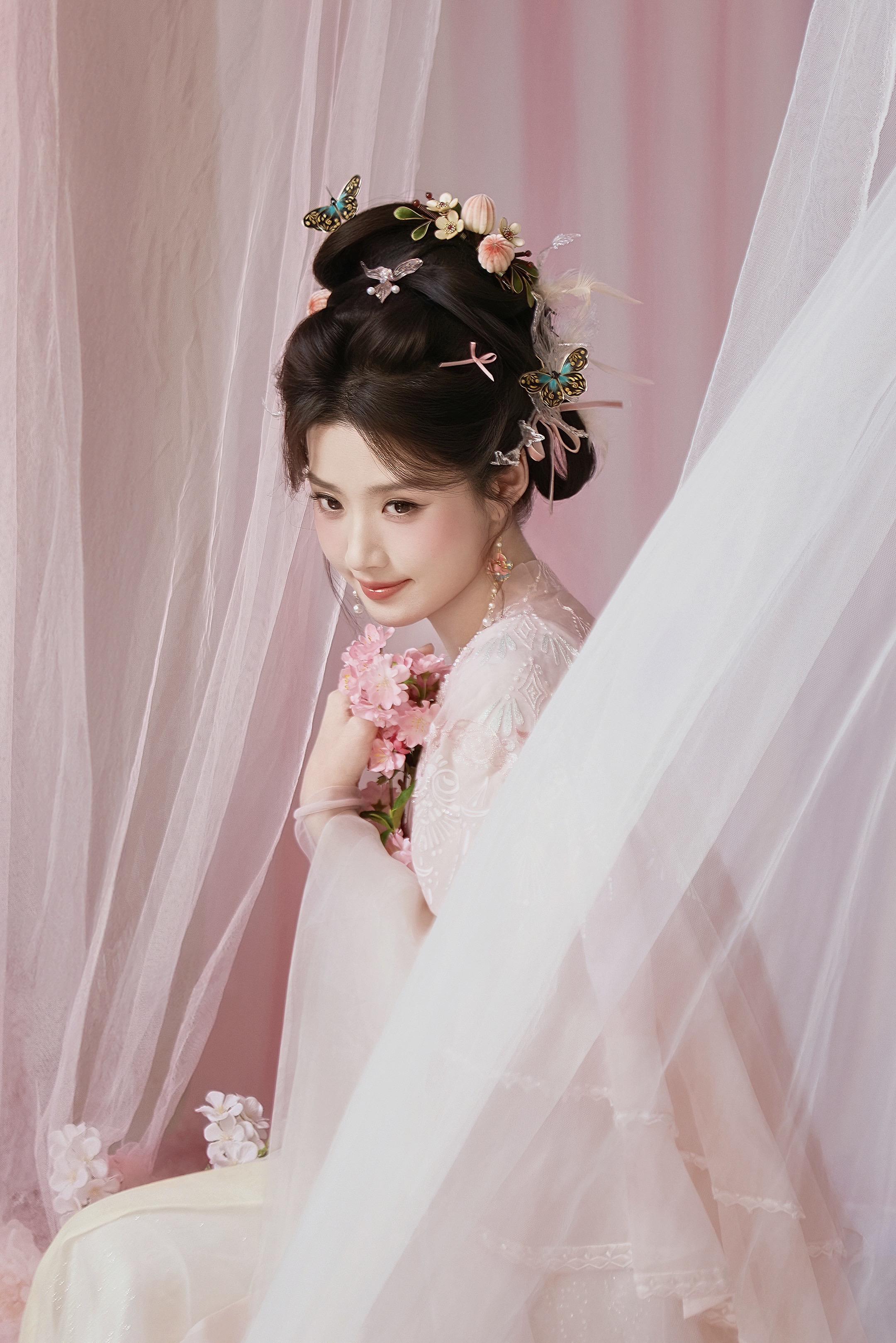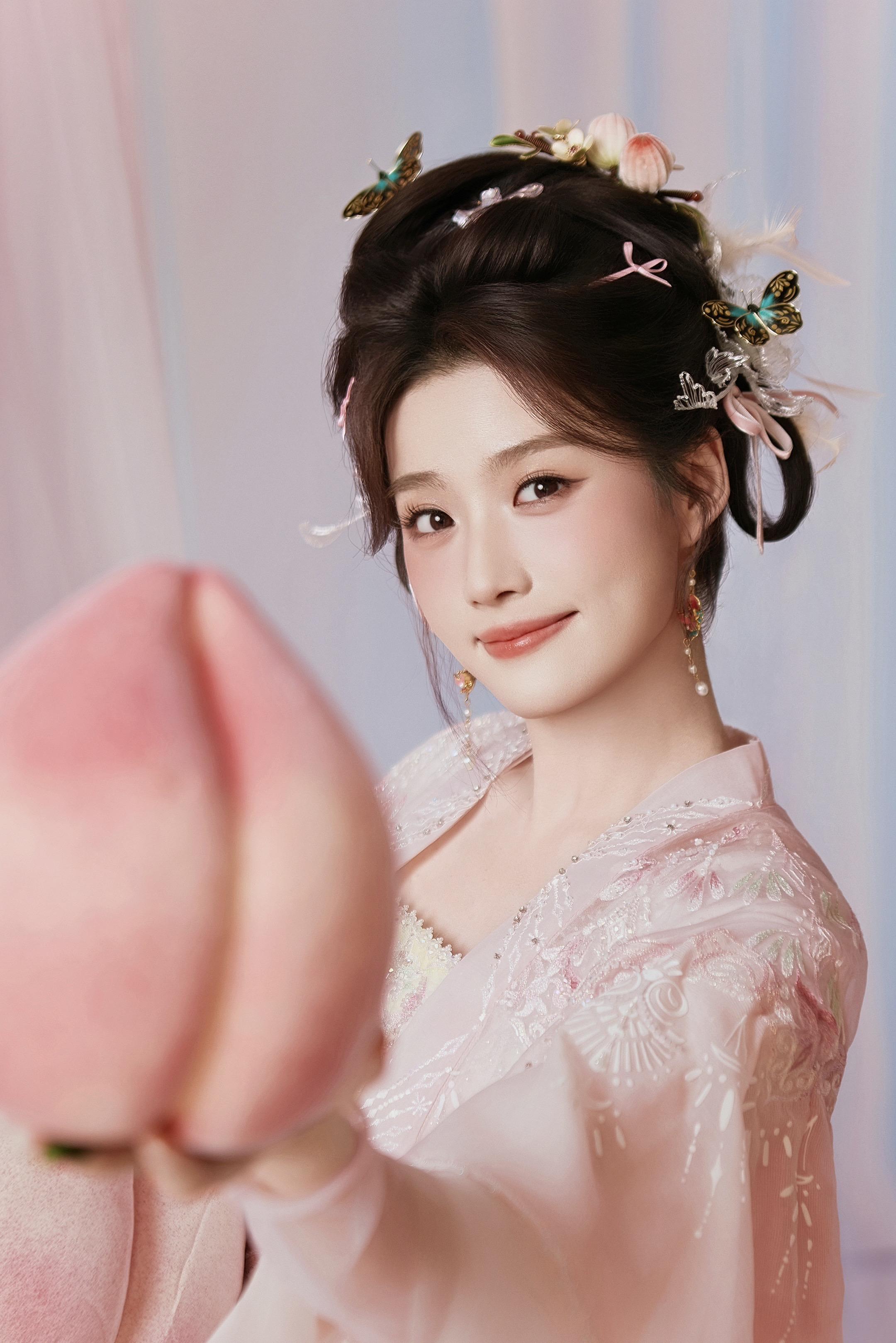 卢昱晓央视跨年晚会造型。蝴蝶和桃子绒花都是我做的~ 谁能拒绝古装造型的噜噜晓呢。 图源:卢昱晓工作室