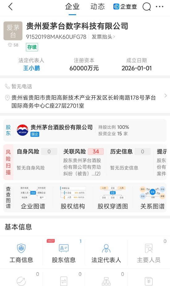 据企查查显示,数科公司由贵州茅台酒股份有限公司100%控股,注册资本为6亿元,经营范围包括互联网信息服务、第二类增值电信业务、软件开发、信息技术咨询服务、互联网数据服务、食品销售等,法定代表人为王小鹏。公开信息显示,王小鹏为茅台集团数字与信息管理部主任。