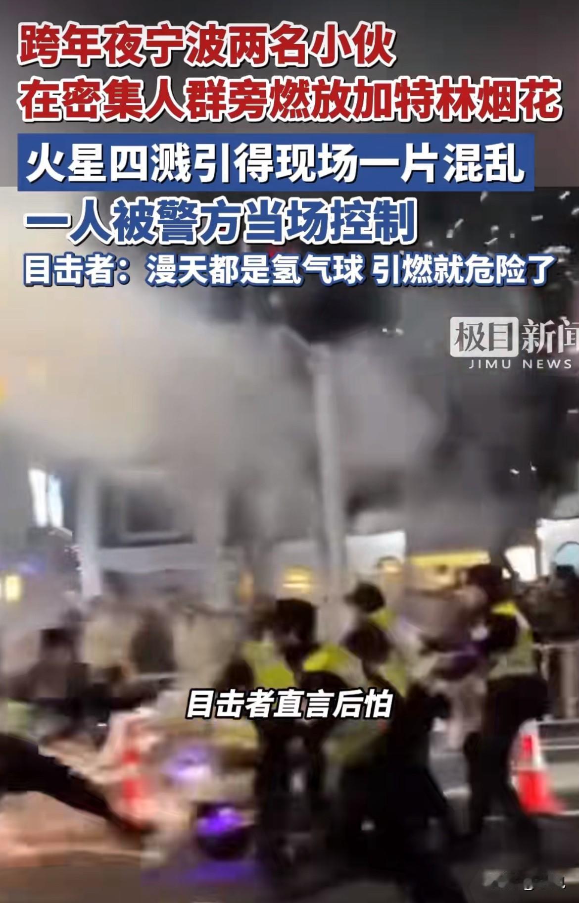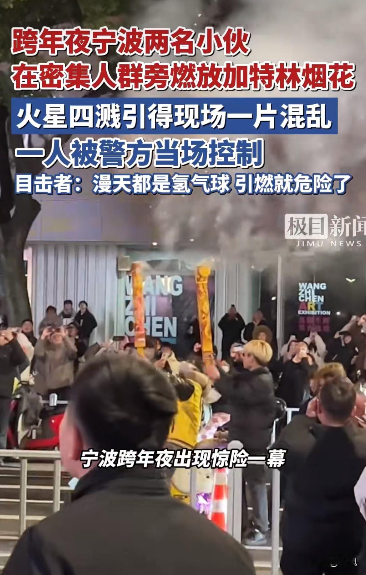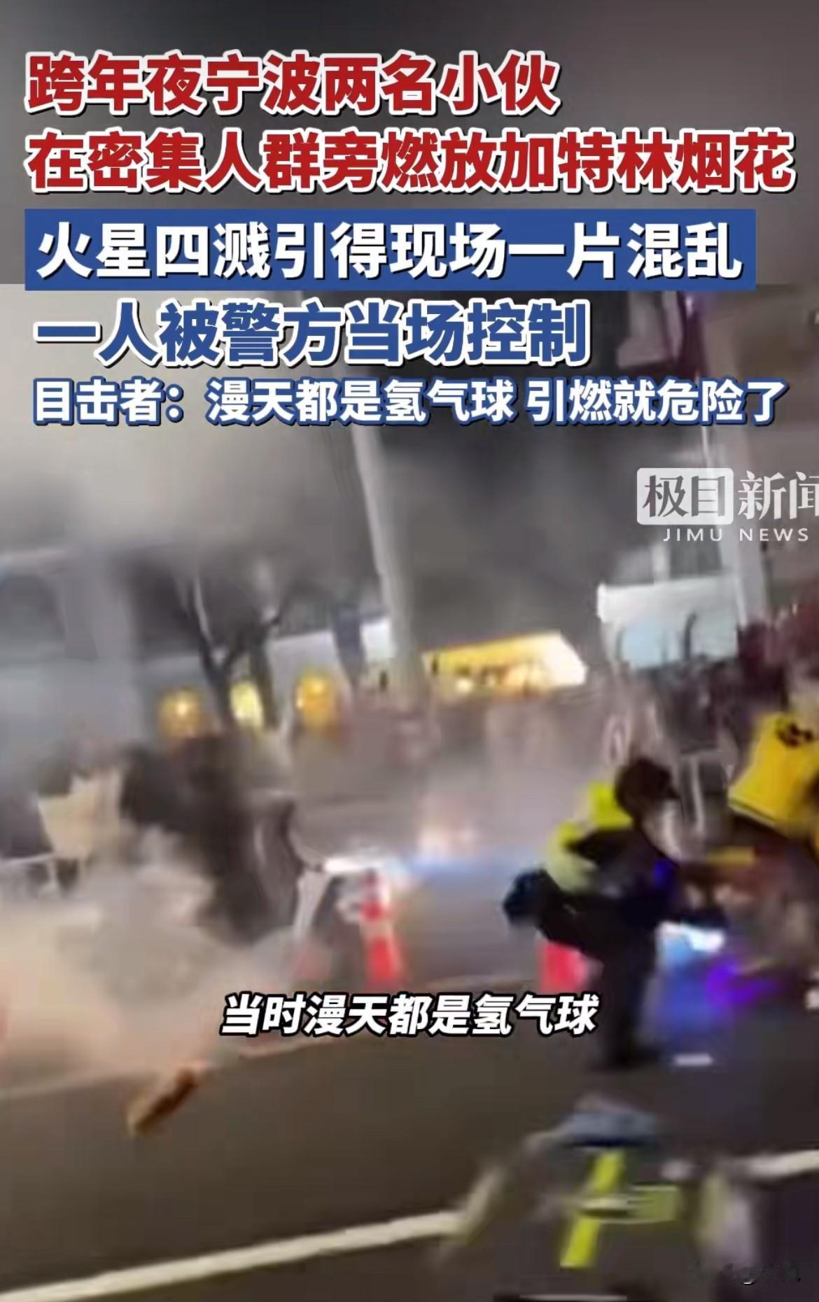2026年第一秒,宁波天一广场,新年欢呼声刚炸开,一串火星子就对着人群和满天气球喷过去了。 一个黄衣服小伙,举着滋滋响的“加特林”烟花,在那猛放。旁边人吓得全往一边躲。黑衣同伙一看警察来了,扔了烟花就跑,黄衣服的当场被按住。 这可不是闹着玩的。他们放的那东西叫“加特林”,网红烟花,火力猛得很。消防做过实验,这玩意喷出的火花,几秒钟就能把厚被褥打穿几十个黑洞,直接点燃。火花能喷出老远。 最要命的是当时天上的东西。跨年那一刻,所有人一起放了气球。目击者说,那很可能是氢气球。一个火星蹦上去,可能就会烧成一片,在人群头顶炸开。那画面,想都不敢往下想。 而且,这地方压根就不能放。天一广场在宁波海曙区,是明确的禁止燃放烟花爆竹区域。跨年前两天,宁波公安还专门发了提醒,严禁往这类商圈带烟花爆竹。他们这纯属顶风上。 这“加特林”自己身上就写着“严禁手持”。可不少人为了拍视频耍酷,偏要拿着放。厂家都怕,怕有人以为放完了,凑近去看,烟花突然喷出来伤着眼睛。 那么,等待这小伙子的会是啥?首先,罚款跑不了。在禁放区放烟花,按规定,一百元以上五百元以下的罚款,可以同时没收东西。这算轻的。 要是真点着了什么,引发火灾,甚至伤了人,那就不是罚款能了事的了。因为违规燃放烟花爆竹引起火灾,可能构成犯罪。如果造成严重损失,可就不是拘留几天的事,而是可能面临有期徒刑。 往大了说,在人群里这么干,算不算“以其他危险方法危害公共安全”?这个帽子很重,但看他干的事,把火箭筒似的烟花对准密集人群和易燃气球,这危险性,他脑子里到底想过没有? 当时广场上多少人?每个人身后都是一个家。你一把“加特林”追求自己几秒钟的痛快,赌上的却是别人一家子的平安。这代价,你付得起吗? 法律把这叫“高度危险物”。出了事,使用者、占有人就得负责。不是你一句“我没想伤人”就能糊弄过去的。 综合信源:极目新闻、上游新闻、新京报、南宁消防、宁波市相关规定等