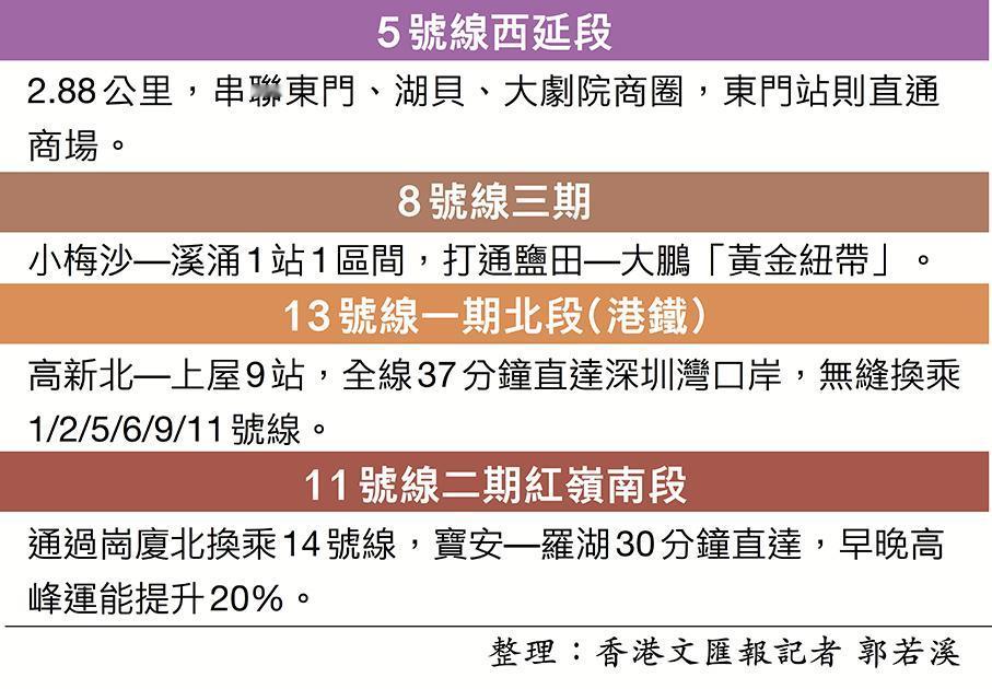 深圳区区地铁全通 4条新线启用! 从深铁集团获悉,昨日(2025年12月31日)深圳市城市轨道交通(含有轨电车,下同)18条运营线路,在跨年夜总客运量达1305万人次,创下单日历史最高客流纪录。 另外,「轨道上的城市,迈入了新阶段」,深圳地铁继9月28日16号线二期、6号线支线二期开通后,12月28日,深圳4条地铁新线(段)同步开门迎客:地铁5号线西延段、8号线三期、11号线二期红岭南段和13号线一期北段(港铁)开通初期运营,全市轨道交通运营里程增至634.5公里,车站441座,实现各区全复盖,向「世界级轨道城市」迈出重要一步。 今天下午高Sir和湾区港女,试一试13号线及5号线的东门站,其中13号线一期北段在车站设计不得不赞,主打 「科技感」与「生态感」,将自然元素与现代科技巧妙结合,打造明亮、舒适又充满活力的乘车环境。北段车站整体採用蓝、绿色调,既清新又显科技范,线条设计融入深圳城市天际线图案,象徵地铁与城市相融共生。而线路特色站秉持「一站一景」理念,将沿线文化特色融入车站空间设计。 特别是石鼓站,由于毗邻大疆、鹏城实验室等科技地标,车站以「科技无境·探索不止」为主题。顶部设计融入无人机流线与螺旋桨灵感,配合流动灯光,彷彿置身未来空间,打卡一流。 近几年,深圳地铁密集「上新」,市民多次收到轨道交通「大礼包」:从2022年「五线三枢纽」集中开通,到2024年5条新线(段)齐发,再到2025年6条线(段)崭新亮相,4年间累计开通地铁14条,枢纽3座,总长度达203.22公里,是深圳持续构建以轨道交通为骨干、地面公交为支撑、多种出行方式为补充的综合交通体系的生动体现,为加速推动深圳产业汇聚、人才吸纳与城市更新注入了强劲动力。 高可达性与便利性使地铁为深圳市民出行的主要选择之一,为全市公交分担率提升至77.5%提供了坚实支撑,也为后续客流的持续攀升构建了高效的基础设施骨架。目前,深圳地铁客运强度达1.50万人次/公里·日,长期稳居全国第一。今年6条新线开通后,深圳地铁客流吸引能力将进一步增强,日均客流将突破900万人次。 深圳蓬勃发展的地铁网络,承载着深圳2000万市民的日常生活,为产业发展输送强劲动能,也折射出深圳城市经济的活力。 深圳地铁线网密度居全国内地城市首位深圳地铁
