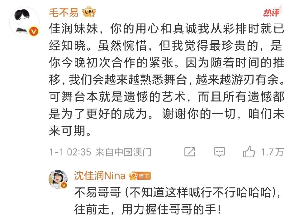 跨年晚会发生了哪些尴尬事? 第一无辜的当属毛不易啊! 我就想知道彩排的时候是啥样的! 沈佳润这么大胆子的吗,明知道是直播,不掂量掂量自己什么水平就上去唱啊! 首先选歌就有问题,这首歌的难唱成都一般女歌手都望而却步,沈佳润的风格完全就驾驭不了这首歌,为啥还要唱? 美美桑内火了,不代表她有唱啥都行嗯实力! 看毛不易在台上尴尬的表情,真同情他啊,就这么妥妥的上了热搜! 还好沈佳润是个素质特别好的孩子,第二天就非常诚恳的公开给毛不易道歉,看出来是发自内心的难为情了,下次好好准备吧,舞台经验还是少。直播可是掺不了假的! 其次是筷子兄弟! 哎呀那简直是,当年KTV里四处飘荡的小苹果都比他俩唱的好听,关键还记不住歌词了,这哥俩像是临时拉出来顶包的,完全没彩排啊,这调跑的也太远了!毛不易 沈佳润 筷子兄弟