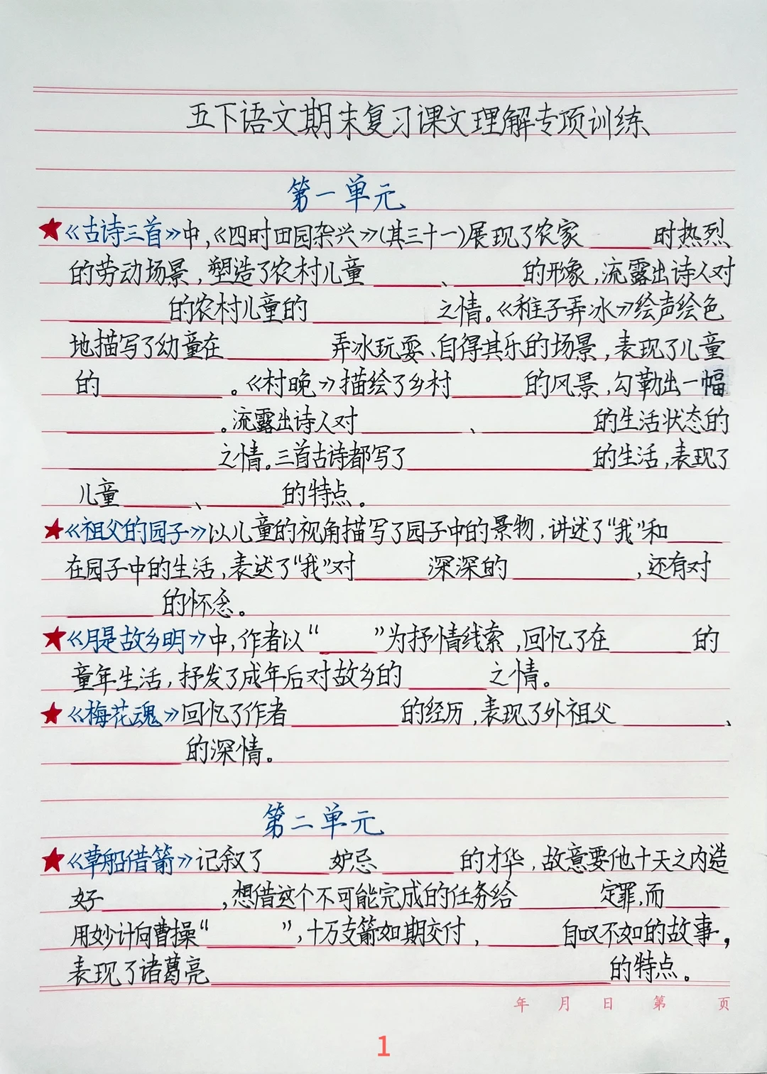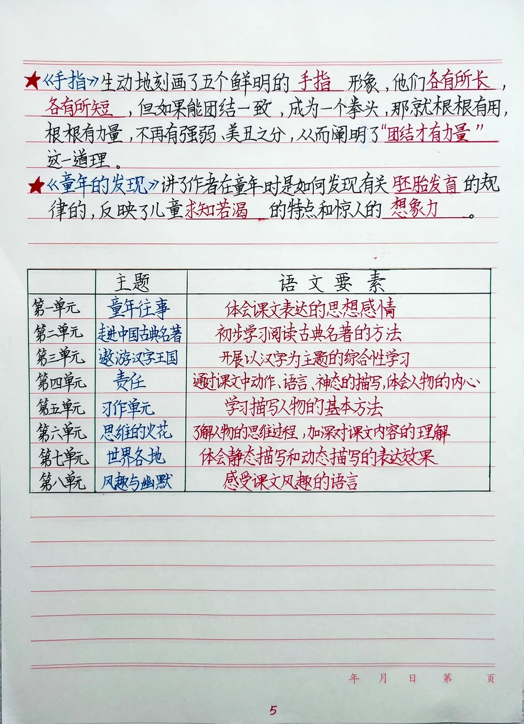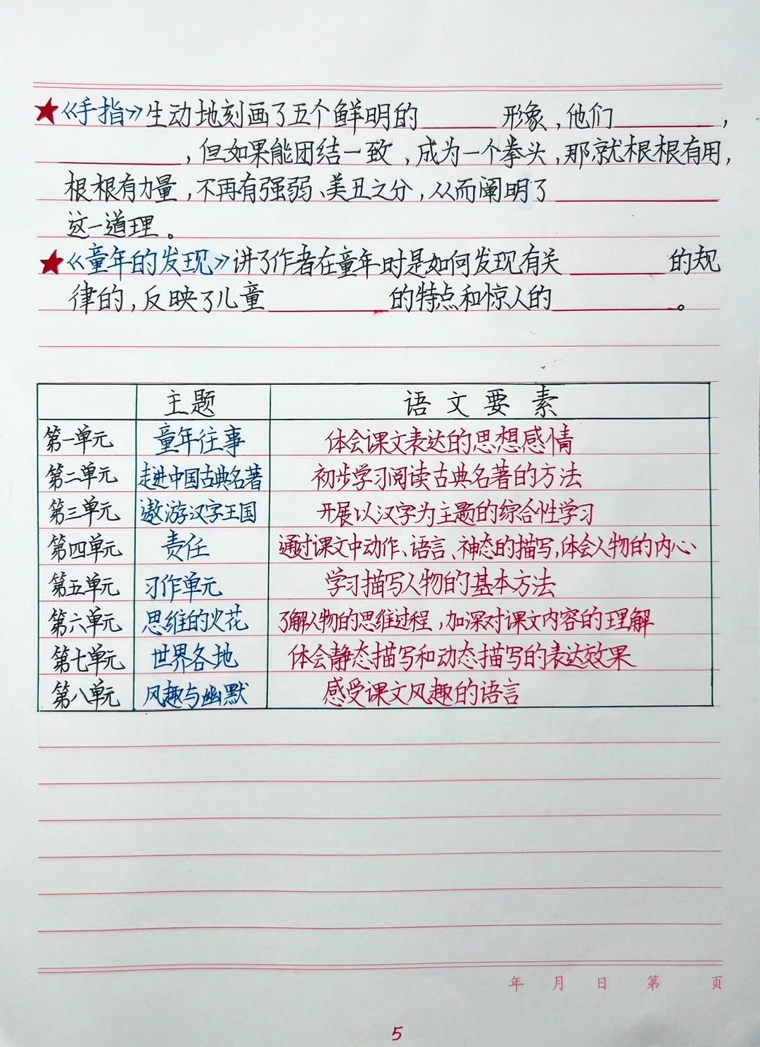 1.单元主题串联:五下语文单元主题多围绕“人物品质、家国情怀、传统习俗”等展开,先列出每个单元主题,再回想每篇课文如何体现主题。
