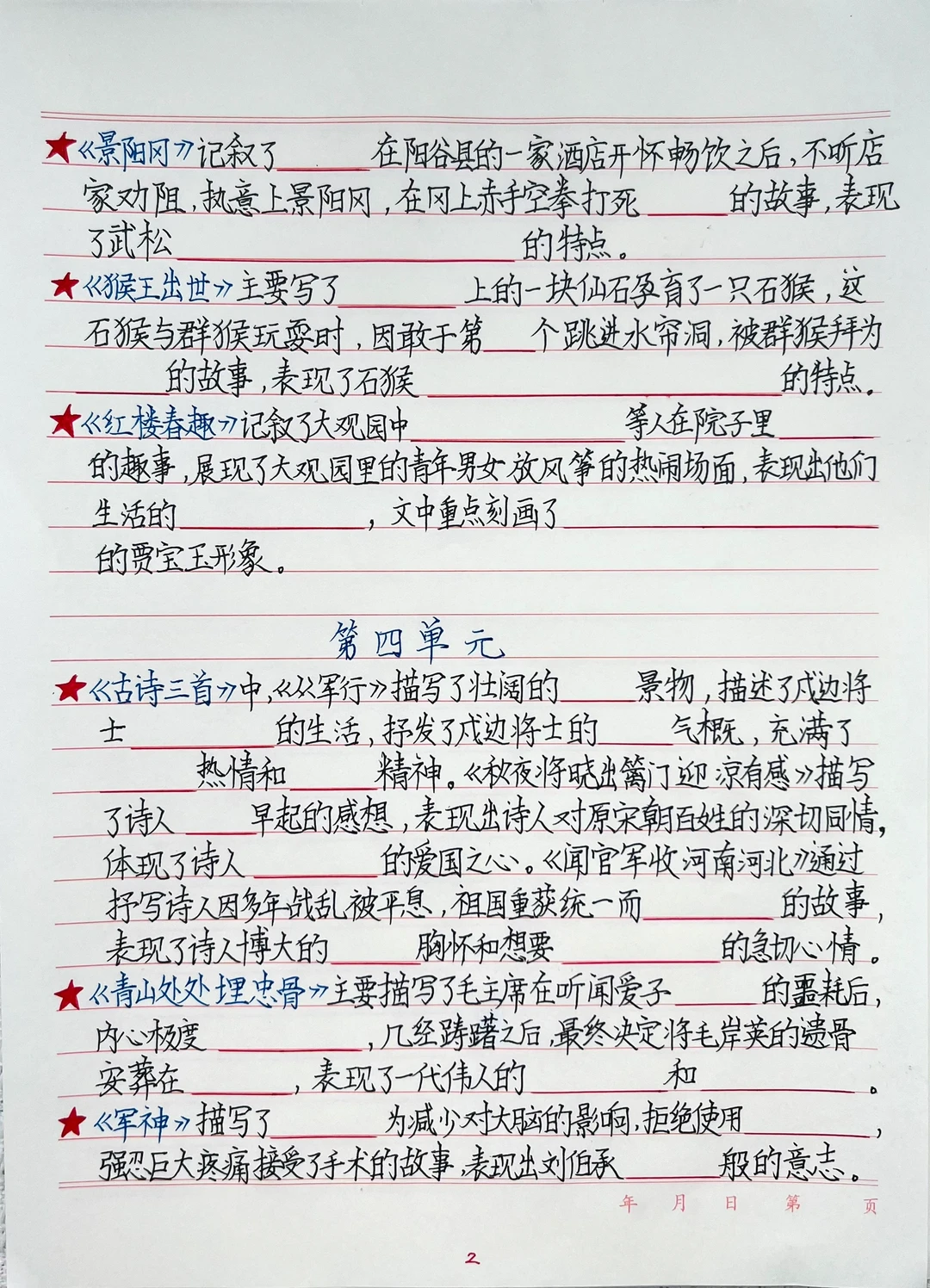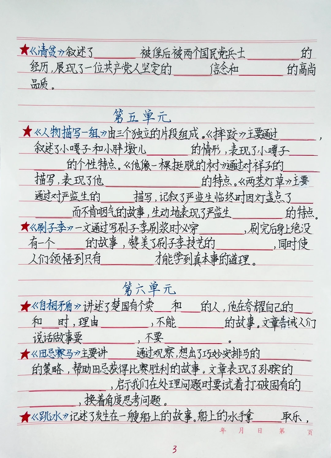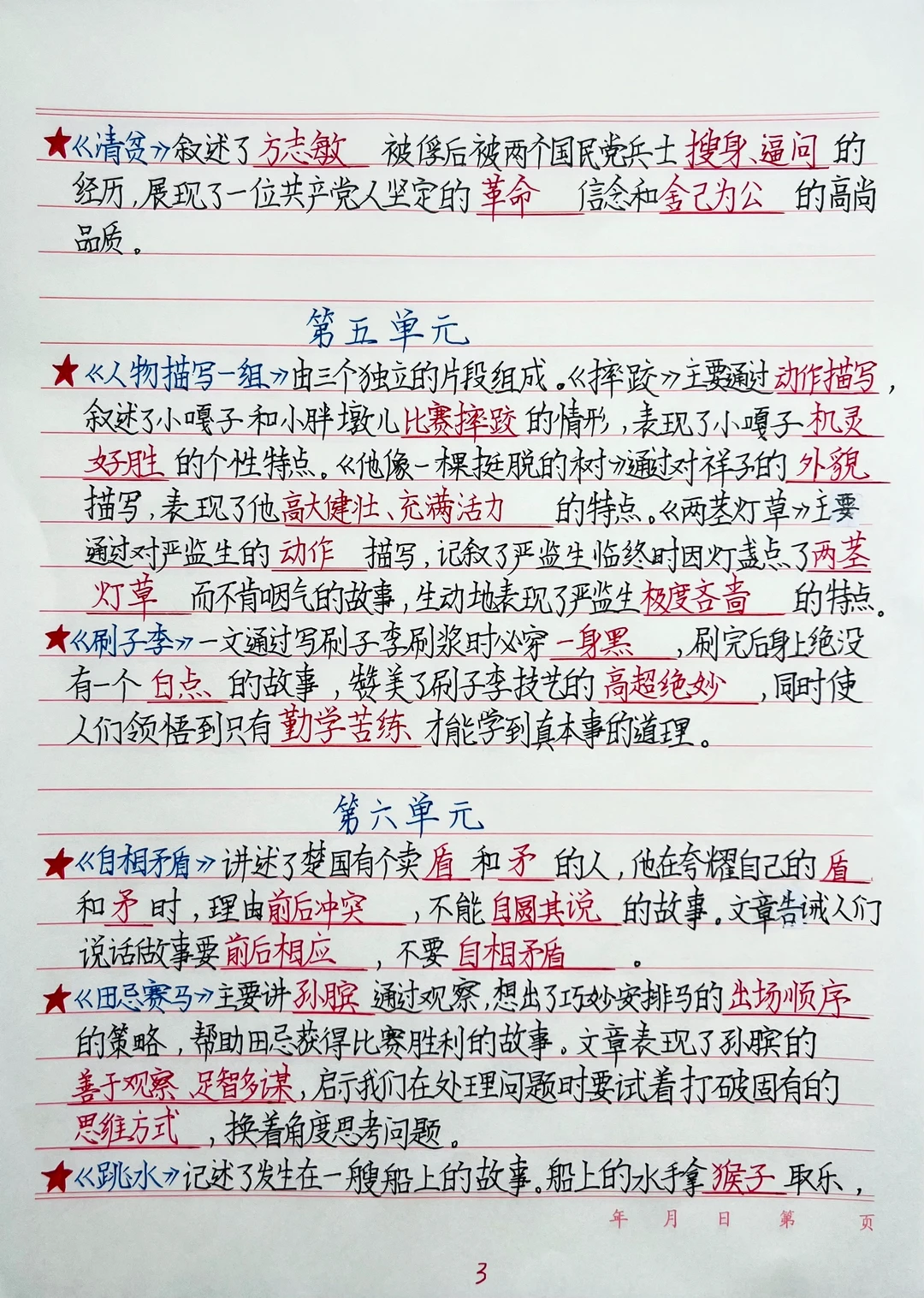 1.人物分析:用“身份+事件+品质”总结(如《清贫》中方志敏作为革命者,面对搜身时的清贫表现,体现廉洁奉公)。