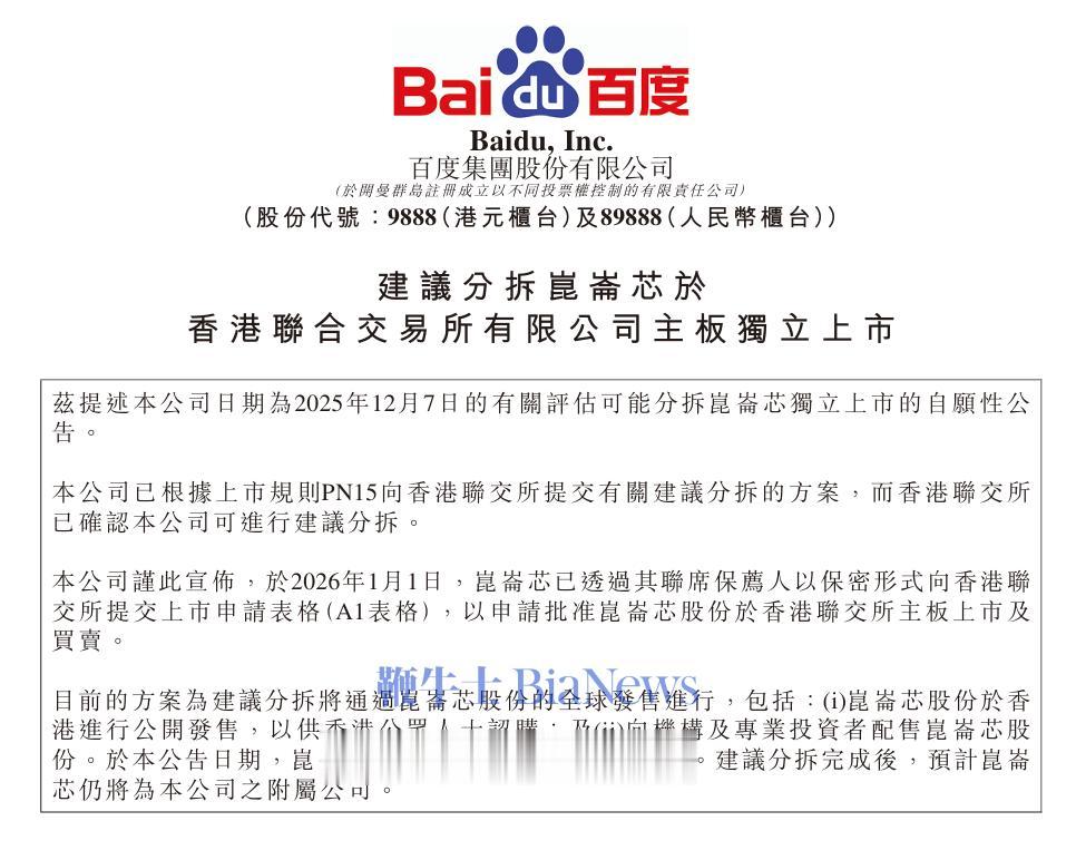 百度:计划分拆昆仑芯业务并于港交所独立上市