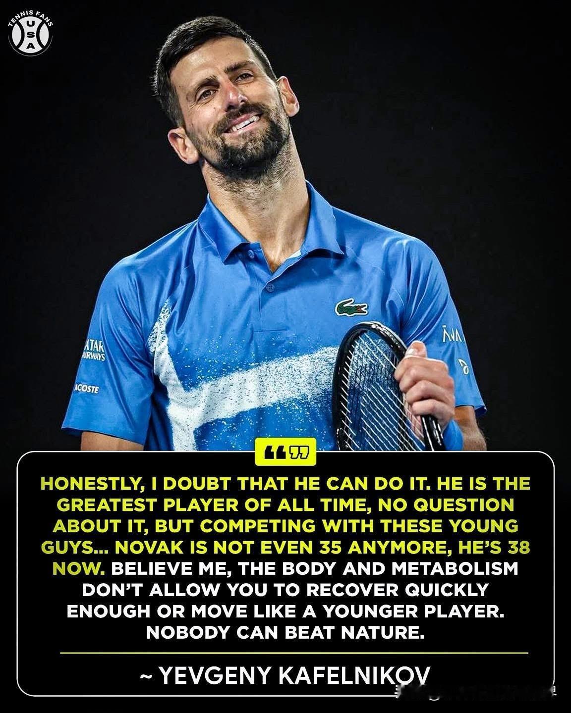 时间不等人,卡费尔尼科夫谈38岁的德约科维奇:“说实话,我怀疑他能不能做到。他是