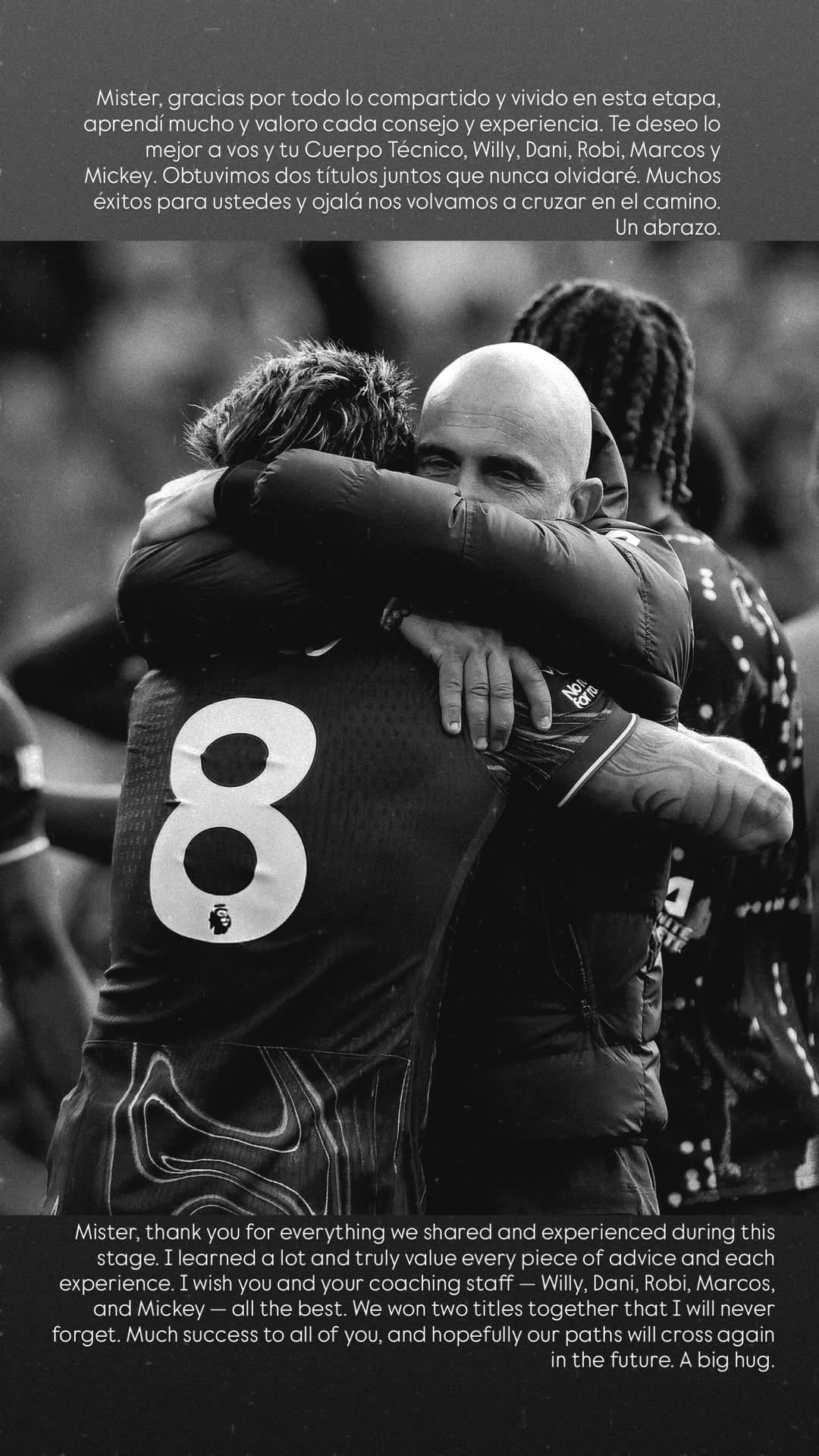 恩佐晒出了自己和马雷斯卡的合照,并配文写道:“教练先生,感谢你在这段时光里与我分享、共同经历的一切。我学到了很多,也无比珍视每一条建议和每一段经历。祝你和你的教练团队——威利、达尼、罗比、马科斯还有米基——一切都好。”