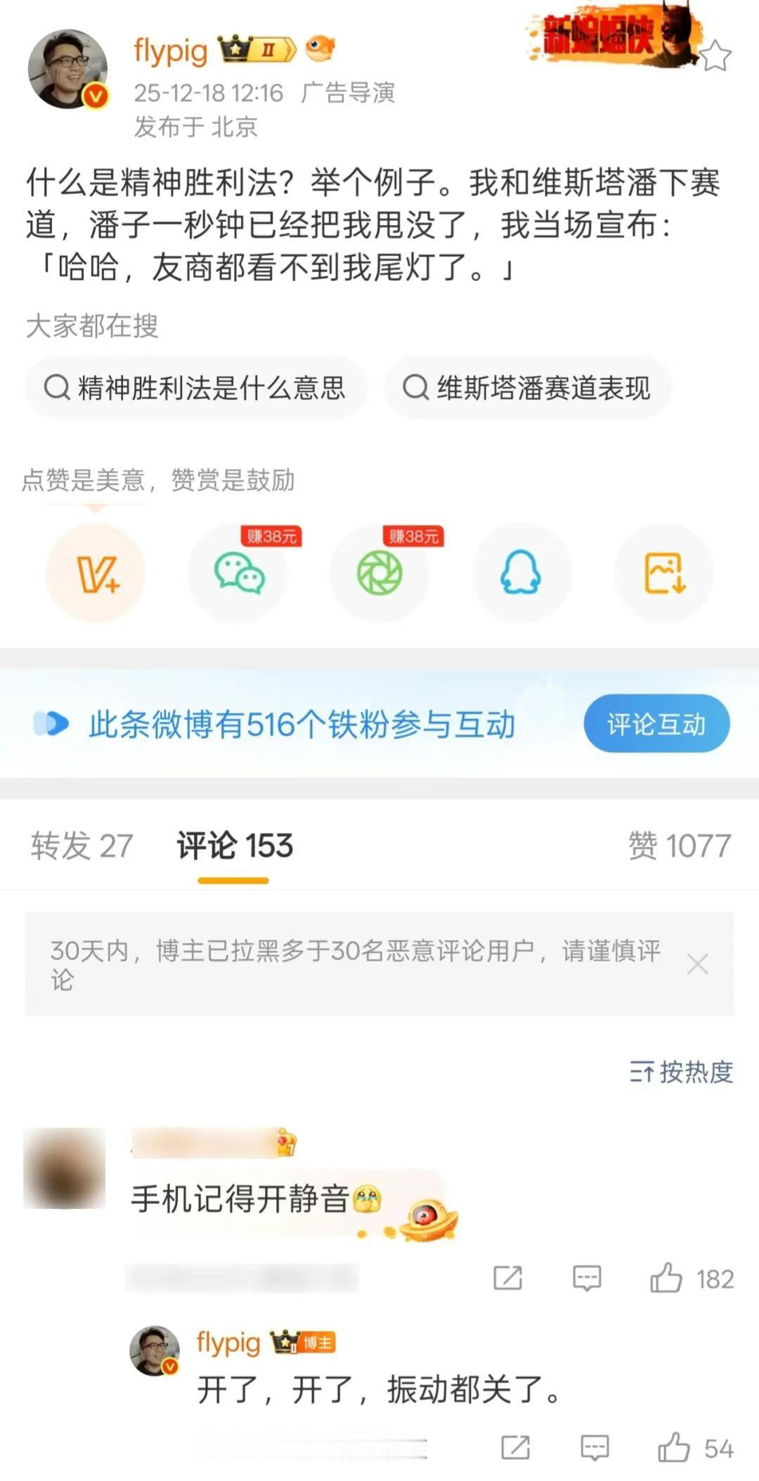 广告导演『flypig』评价荣耀罗巍的“让友商看不到尾灯”是精神胜利👇🏻👇🏻👇🏻 “什么是精神胜利法?举个例子。我和维斯塔潘下赛道,潘子一秒钟已经把我甩没了,我当场宣布:「哈哈,友商都看不到我尾灯了。」 ”