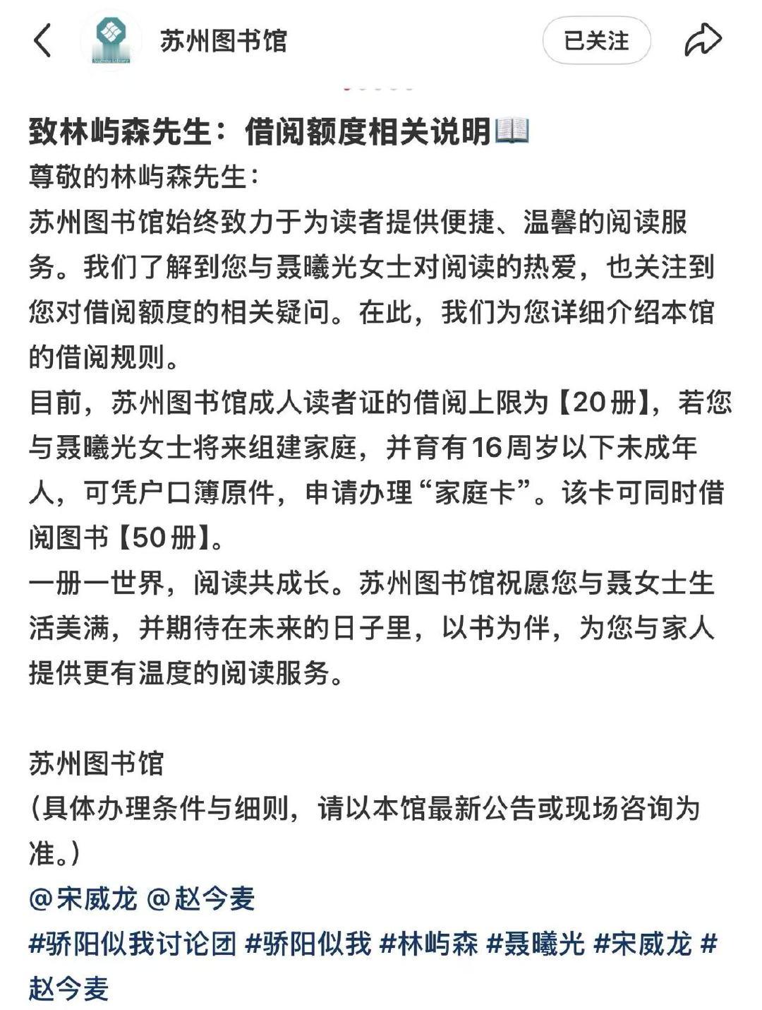 苏州图书馆回应林屿森苏州图书馆致林屿森借阅额度说明 在电视剧《骄阳似我》中,聂曦光说要去苏州图书馆借书,“那我去苏州图书馆好了,人家都没有你这么小气。”林屿森对聂曦光道:“苏州图书馆一次也只能借五本”,苏州图书馆官方账号在线回应林屿森:“目前成人读者证的借阅上限为20册。”网友:2026最快公关苏州图书馆。骄阳似我 奇耻大辱