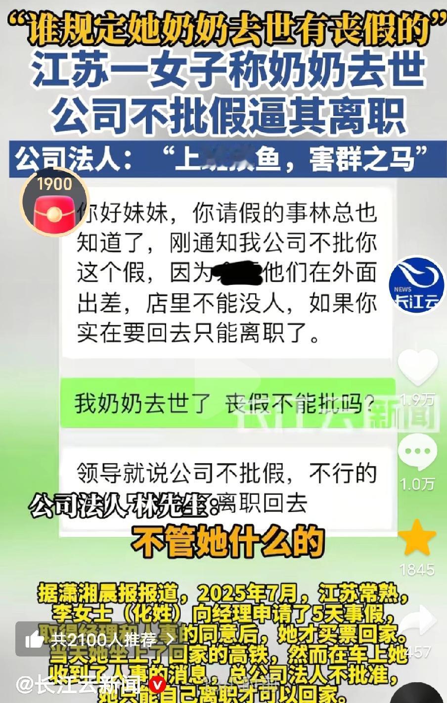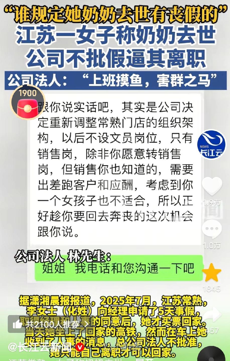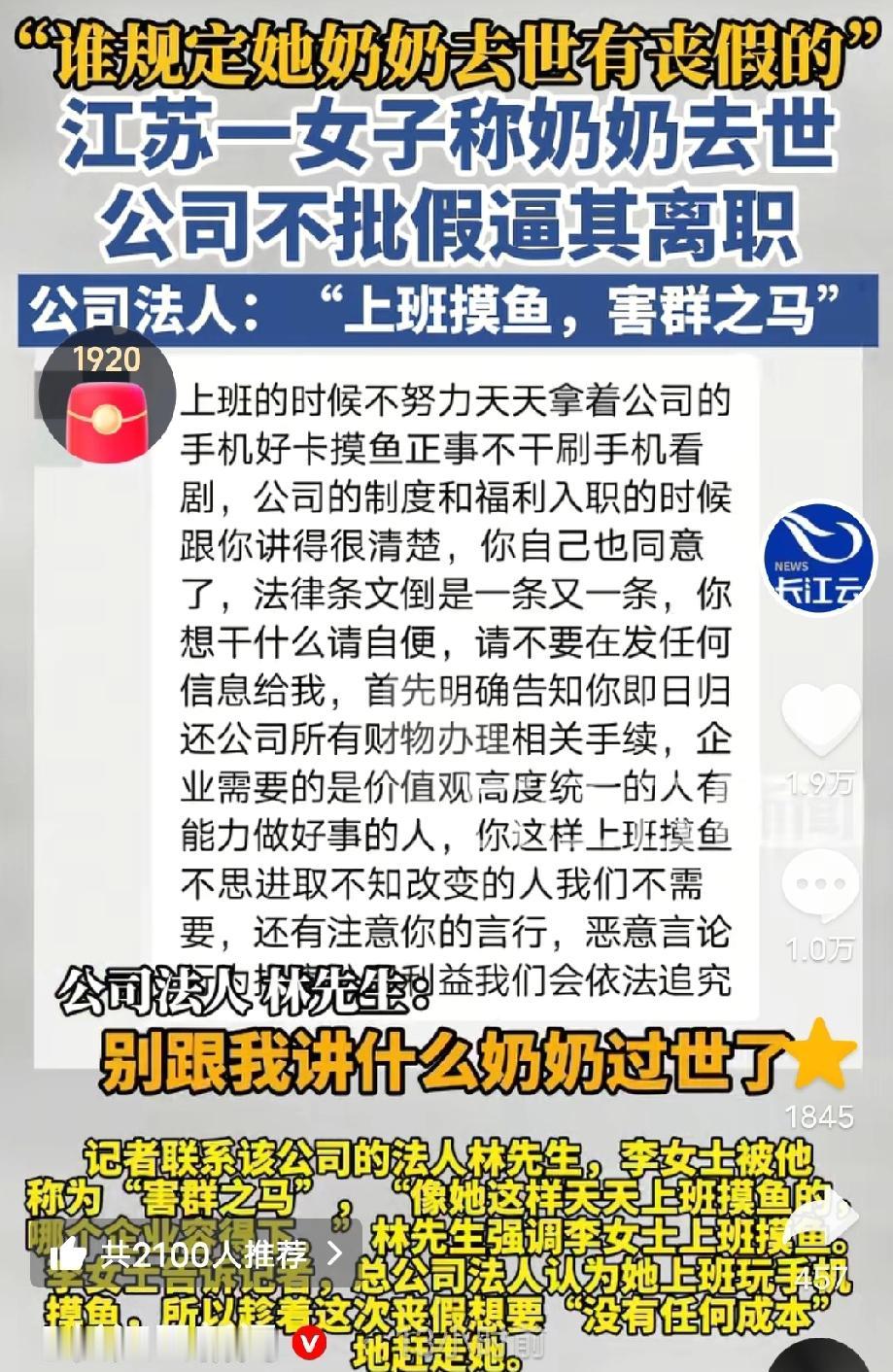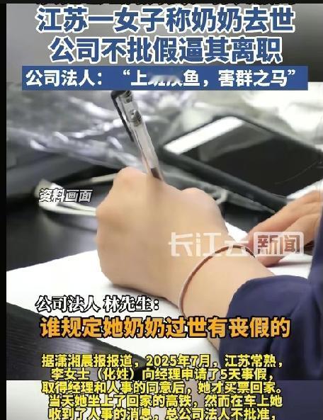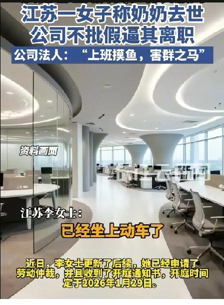 2025年7月,江苏常熟,李女士依规向经理申请了5天事假,在得到了经理和人事的双重首肯后,她才放心地买票回家。不料,她刚坐上高铁就收到人事的消息:总公司法人不批准,并语气强硬地告知:想回家奔丧?可以,必须自己离职! 李女士懵了,她委屈地回复:“不请假回来上班可以吗?” 人事断然拒绝:“不行,回来了要么自己离职,要么公司开除。” 那一刻,李女士情绪彻底崩溃,在高铁上哭着和人事打语音电话哀求,等奶奶丧事后再做决定,但电话那头,人事依旧没有改口。 为什么公司如此绝情? 记者采访了公司法人林先生说,她上班玩手机摸鱼,所以想趁着这次丧假,以“没有任何成本”的方式将她赶走。 但这所谓的“摸鱼”指控,在李女士看来简直荒谬至极。 她工作的分公司环境简陋,根本没有监控、没有WI-FI,也没有打卡机。 李女士认为公司没有自己上班摸鱼的证据,这么做就是想赶走她。 真相似乎并不复杂。 李女士说,总公司决定调岗,不设文员岗位,只设销售岗,考虑到她一个女孩子不适合做,所以趁这次回去奔丧的机会才说的。 原来,丧事只是老板眼里一个绝佳的“裁员时机”。 一纸诉状,开庭时间定档2026年 回到家后,李女士没有选择忍气吞声。她找了律师代写了一份《被迫解除劳动关系通知书》并邮寄到公司,要求公司尽快结清工资,给予辞退赔偿金。然而,公司对此置若罔闻。直到2025年8月底,李女士才收到了自己的工资,但赔偿金却分文没有。 更让她后怕的是,李女士意识到,在这家公司干了一年多,公司竟然从来没有给她缴纳社保。虽然入职时人事曾含糊提起过,但那时的她法律意识淡薄,如今才明白这是严重的违法行为。李女士决定反击,她向常熟市劳动人事争议仲裁委员会提起了申请劳动仲裁。 近日,李女士已经申请了劳动仲裁,开庭时间定于2026年1月29日。她希望通过仲裁,拿回属于自己的赔偿金、补缴社保以及加班费。 而李女士的维权之路并不简单。 面对采访,公司法人似乎铁了心,并不掩饰对李女士的厌恶,甚至直接称其为“害群之马”。 并且说:“像她这样天天上班摸鱼的,哪个企业容得下?…谁规定她奶奶去世有丧假?我就是要开除她,不管什么的,不要跟我讲什么奶奶过世爷爷过世,谁爷爷奶奶不过世…” 看来这场风波,才刚刚开始。 对此,有网友说:“爷爷奶奶去世的确没有丧假的,但可以正常请年假事假,这个就是老板想开除她,其他都不重要。” 我相信,法律也许会迟到,但绝不会缺席。 看来这场纷争只能交给法律,谁是谁非终见分晓。