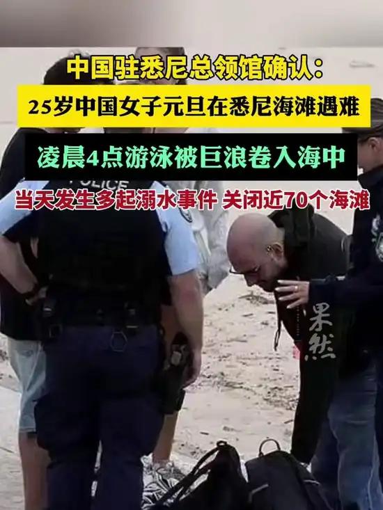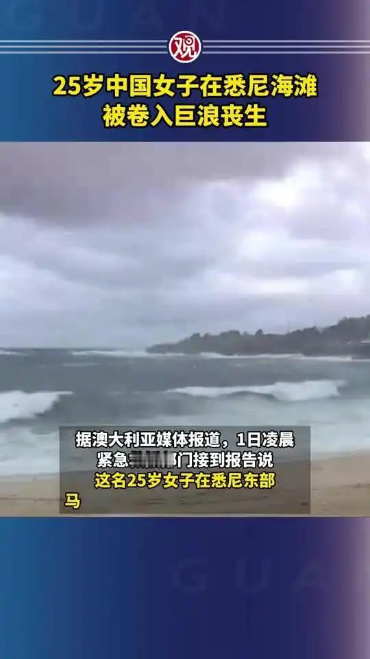 悲剧!25岁中国女子元旦悉尼海滩溺亡 2026年1月2日,一则令人痛心的消息传来:据新华社及澳大利亚多家媒体报道,元旦当天,一名25岁的中国籍女子在悉尼马鲁布拉海滩附近遭遇不幸,被巨浪无情卷入海中,最终香消玉殒。 当地时间1月1日凌晨4点左右,悉尼马鲁布拉海滩正被恶劣海况笼罩,狂风掀起滔天巨浪。此时,这名年轻女子在海边游泳,不慎被巨浪卷走。紧急救援部门迅速接到报告,多部门联合搜救队第一时间赶赴现场展开救援。经过紧张搜寻,凌晨5时左右,救援人员找到了她,然而,尽管全力抢救,女子还是没了生命迹象,当场确认死亡。 更令人揪心的是,当天新南威尔士州沿海海况极为恶劣,多起溺水事件接连发生,为保障游客安全,当地紧急关闭了近70个海滩。中国驻悉尼总领馆在2日确认了这一悲剧,表示正与各方密切联系,积极处理后续事宜,为遇难者家属提供必要协助。 在此也提醒广大游客,海滩游玩务必注意安全,密切关注天气和海况,切勿在危险条件下下水,避免类似悲剧再次上演。