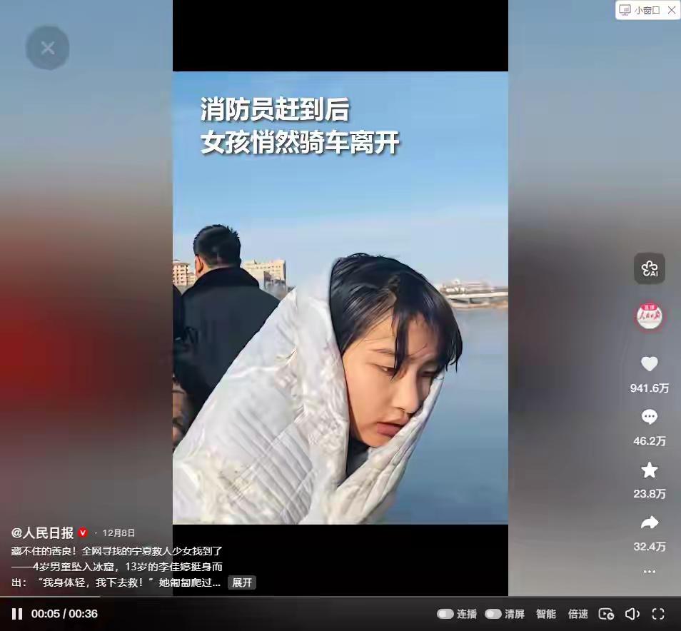 不到30天,人民日报两次点名李佳婷!13岁的她再传喜讯,前途稳了 13岁宁夏女生李佳婷冰窟救4岁男童,不到30天获人民日报两次点名,12月30日再获“见义勇为先进个人”,前途被一致看好 。 核心事件 - 12月6日15时许,宁夏同心县豫海湖,4岁男童坠入冰窟 。 - 路过的李佳婷(同心县二中七年级)接塑料管匍匐施救,冰面二次破裂致她落水,仍紧抓救援绳,为专业救援赢时间,男童最终获救 。 - 她浑身湿透离开,回家谎称被洒水车淋湿;家人当晚看视频才知真相,她不会游泳却挺身而出 。 人民日报两次点名 - 12月9日:首报事迹,点赞她“危急时刻挺身而出,彰显新时代青少年责任与担当”。 - 12月30日:再聚焦,肯定其善良勇敢与官方表彰保护的社会价值。 重磅表彰与福利 - 12月8日:县府慰问金1万元;县医院“终身免费体检”;学校评“见义勇为美德好少年” 。 - 12月17-23日:县府公示其见义勇为,无异议 。 - 12月30日:县府授予“见义勇为先进个人”,奖金增至2万元,将推荐参评更高层次表彰 。 - 额外:获阿里公益天天正能量特别奖;婉拒男童家长酬金,仅收心意礼品。 未来可期 她立志当消防员,愿帮助更多人 。官方表彰、媒体点赞、社会认可,既为成长铺路,也成青少年榜样,未来稳稳当当。