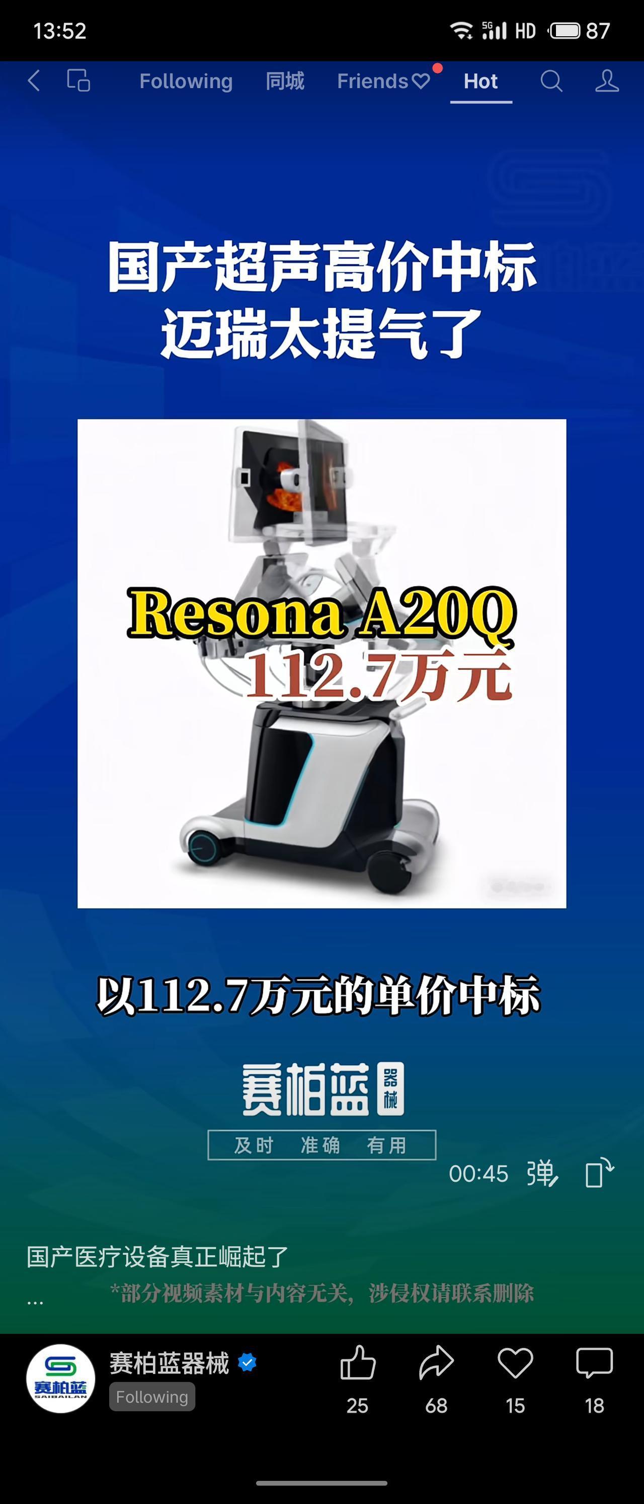 国产医疗设备实现突破:迈瑞Resona A200超高端彩超以单价112.7万元中标,数量12套;而同为超高端机型的进口品牌GE LOGIQ E20单价为92.3万元。此次高价中标被视为国产医疗设备崛起的标志性事件。